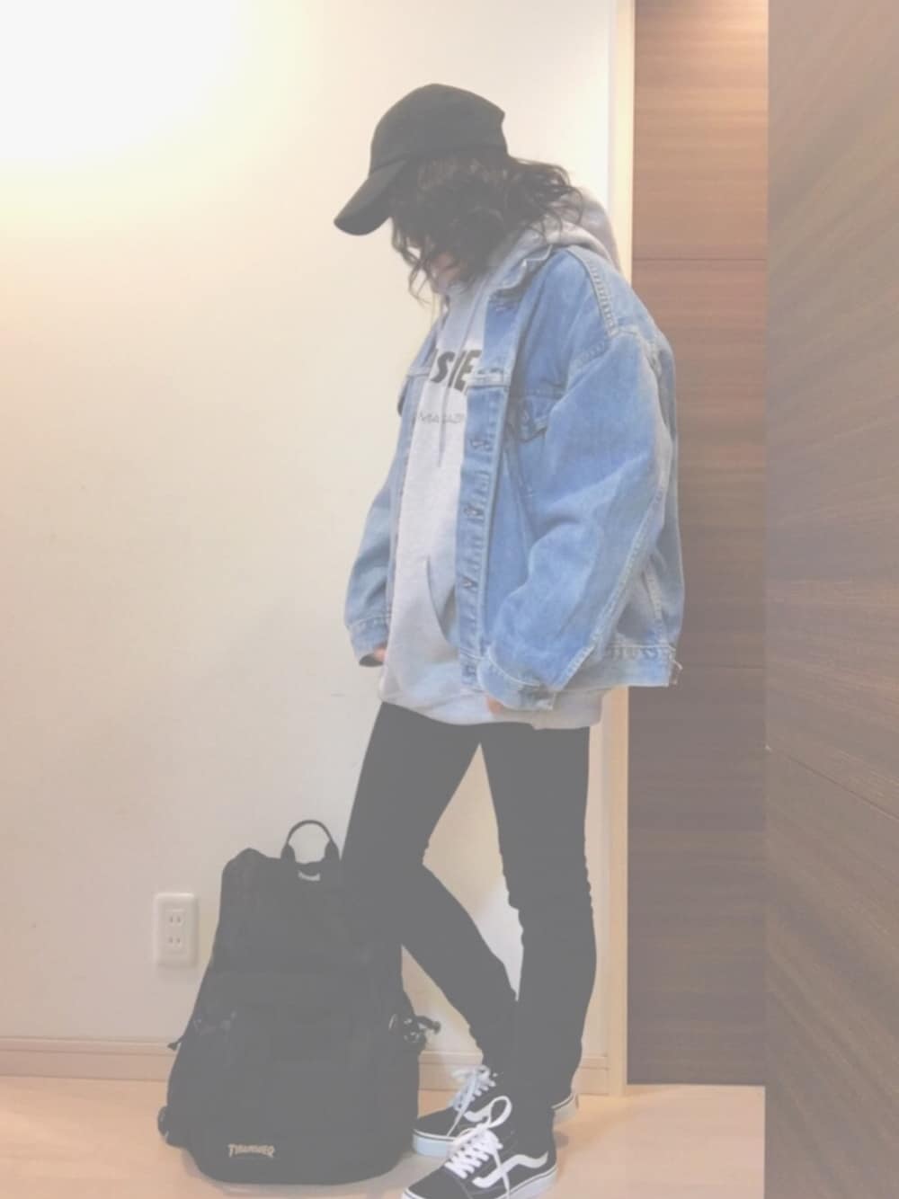 THRASHERのパーカーはビッグシルエットで着回しがきいて◎ WEGOで買ったUSEDのデニムジャケットを合わせるとボーイッシュになっちゃうので髪を巻いて女の子らしく💕小窓に載せておいたので是非見てみてください💭