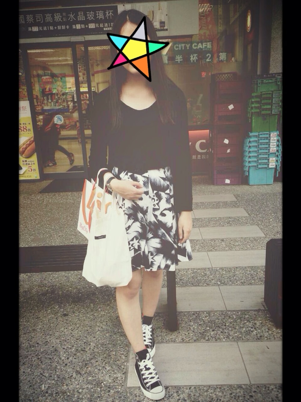 黑外套。 黑素面上衣。 黑白圖案裙 Convers鞋