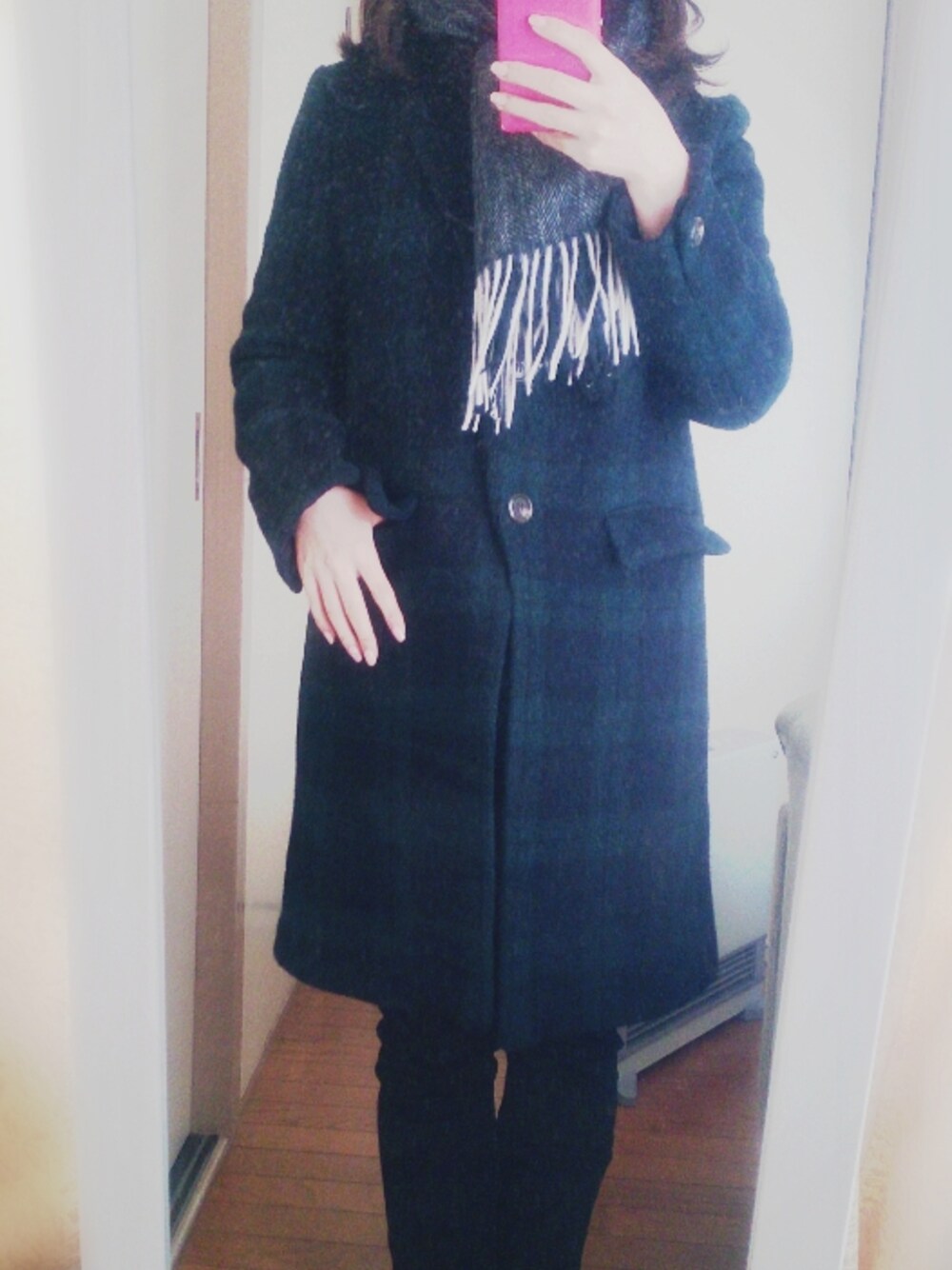 明けましておめでとうございます。 新しいコートを12月に買いました。 ラボラトリーワークスのコート、サイズが大きかったので、シングルボタンだったのを襟の上の方にボタンを追加&袖はいつも通り短くしました。 お直しは4000円くらい。 全体的にまだ大きいけど、ゆったり暖かい♪ パンツはビアズリーでコーデュロイのスキニーを見つけたのでコートに合わせてみました。 マフラーもコートの色に合わせて、indiviでグリーとブラックのバイカラーが可愛くて購入。 ブリティッシュスタイルが好きなので、ちょっとメンズライクだけど今年の冬スタイル決まりました。 今年もささやかながら参加します。