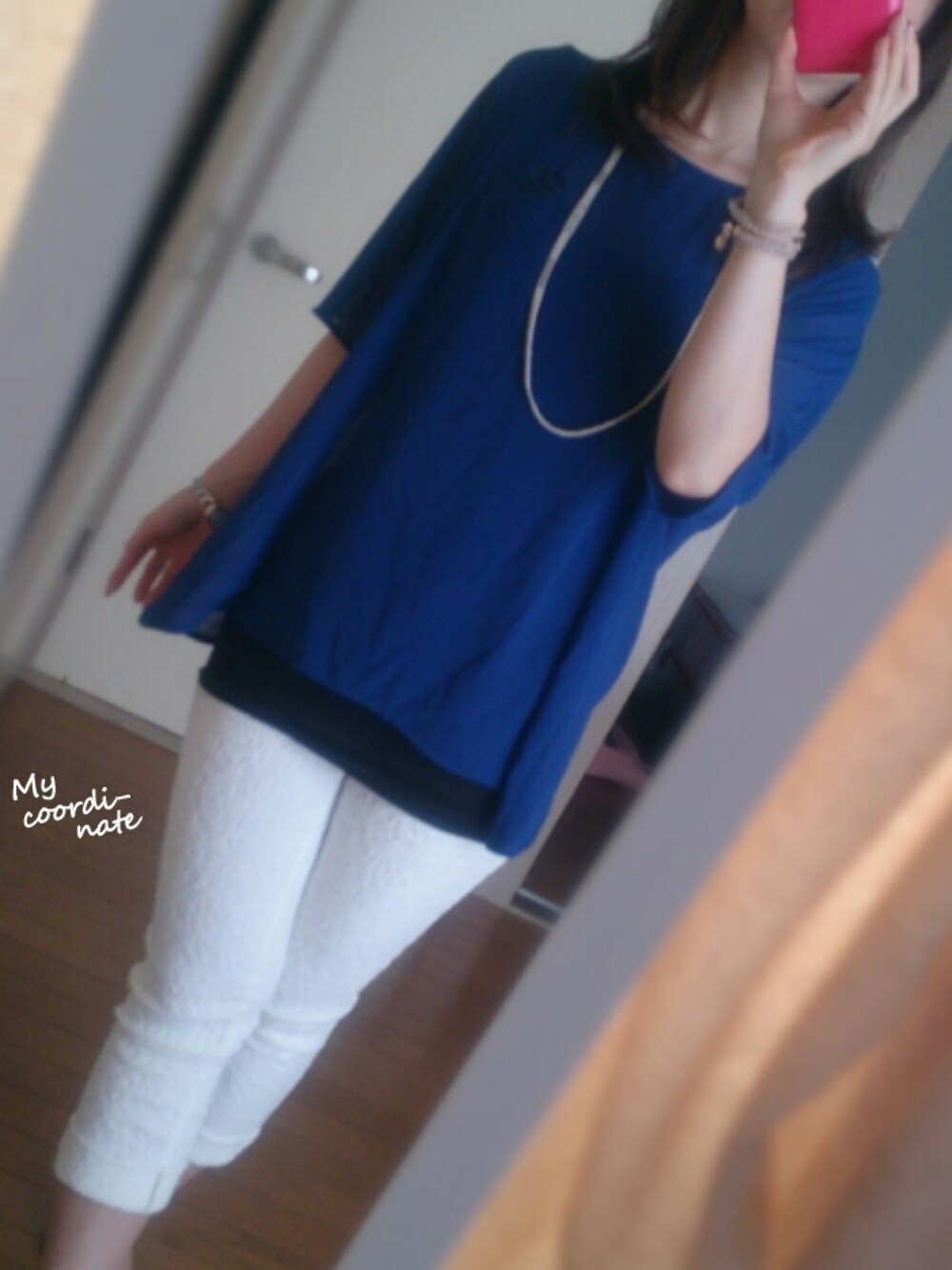 お一人様でお出かけ ビアズリーの楽チンスキニーパンツ。 真っ白だけどレース生地みたいな生地でお気に入り。 トップスはソフィットの唇マークがポイント。 いつもブレスレットにしているパピヨネのブレスは今日はネックレス風にしてみた。