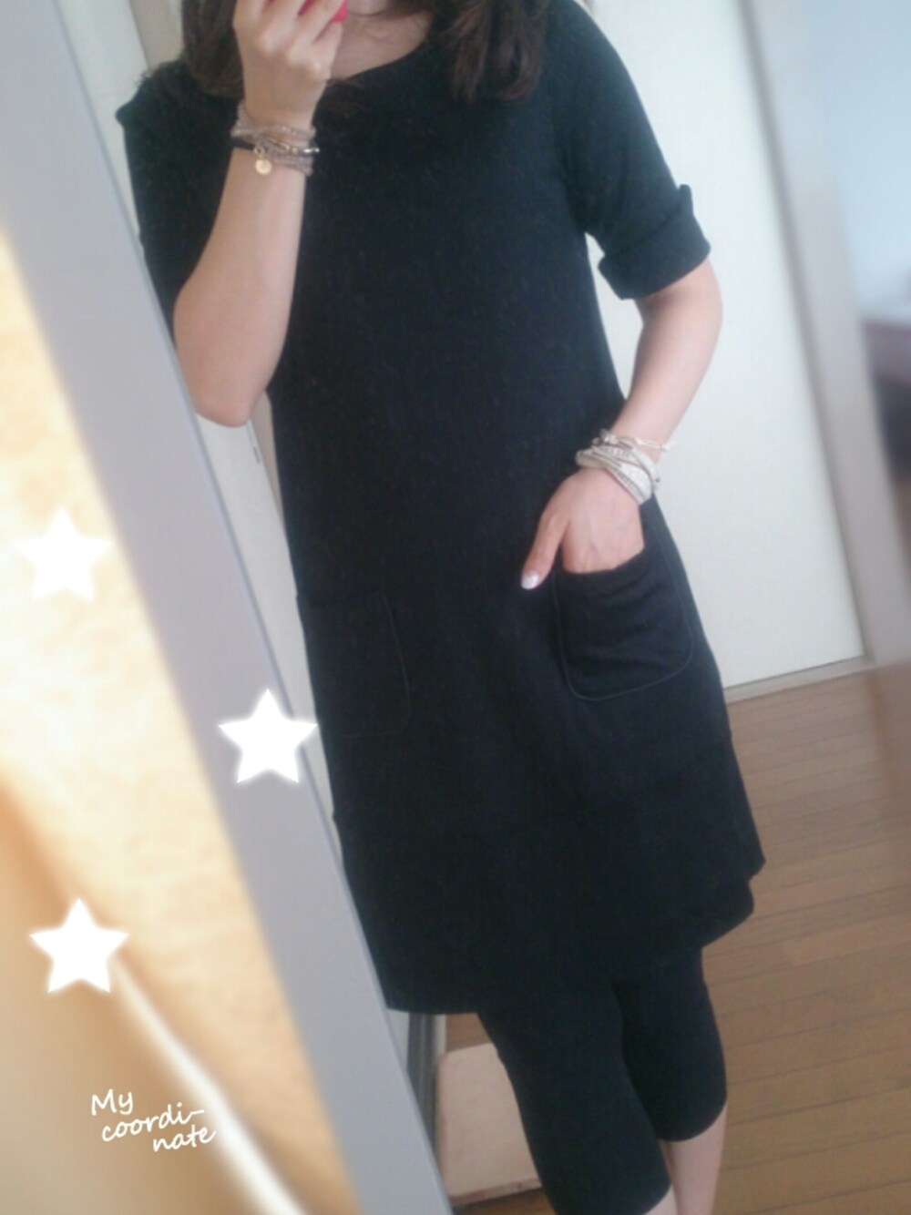 シックに黒ワンピ ほとんど着ないワンピース&スカート 最近ファッション怠け気味。ダイエットも怠け気味。 あまり着ないINDIVIの黒のワンピース、涼しくなってきたし着てみた。 レギンスでちょうどいい。 デートに着て行かないところがポイント☆ シンプル過ぎて寂しい感じ 5号サイズのワンピースはさすがに小さい。 太ったら着れない!