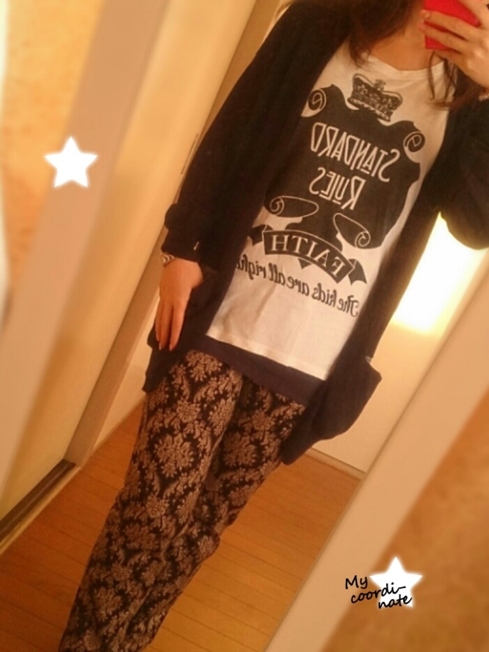 初柄パン 小さいサイズのお店で柄模様小さめの柄パンを見つけたので購入。 7号サイズで少し大きめ。 ベージュ地に黒の柄で奇抜すぎず会社にも履いていけそう♪ トップスは紺色のキャミとTシャツ、紺色の長めカーディガン。 柄パンは難しいので他にも着回し見つけたい。