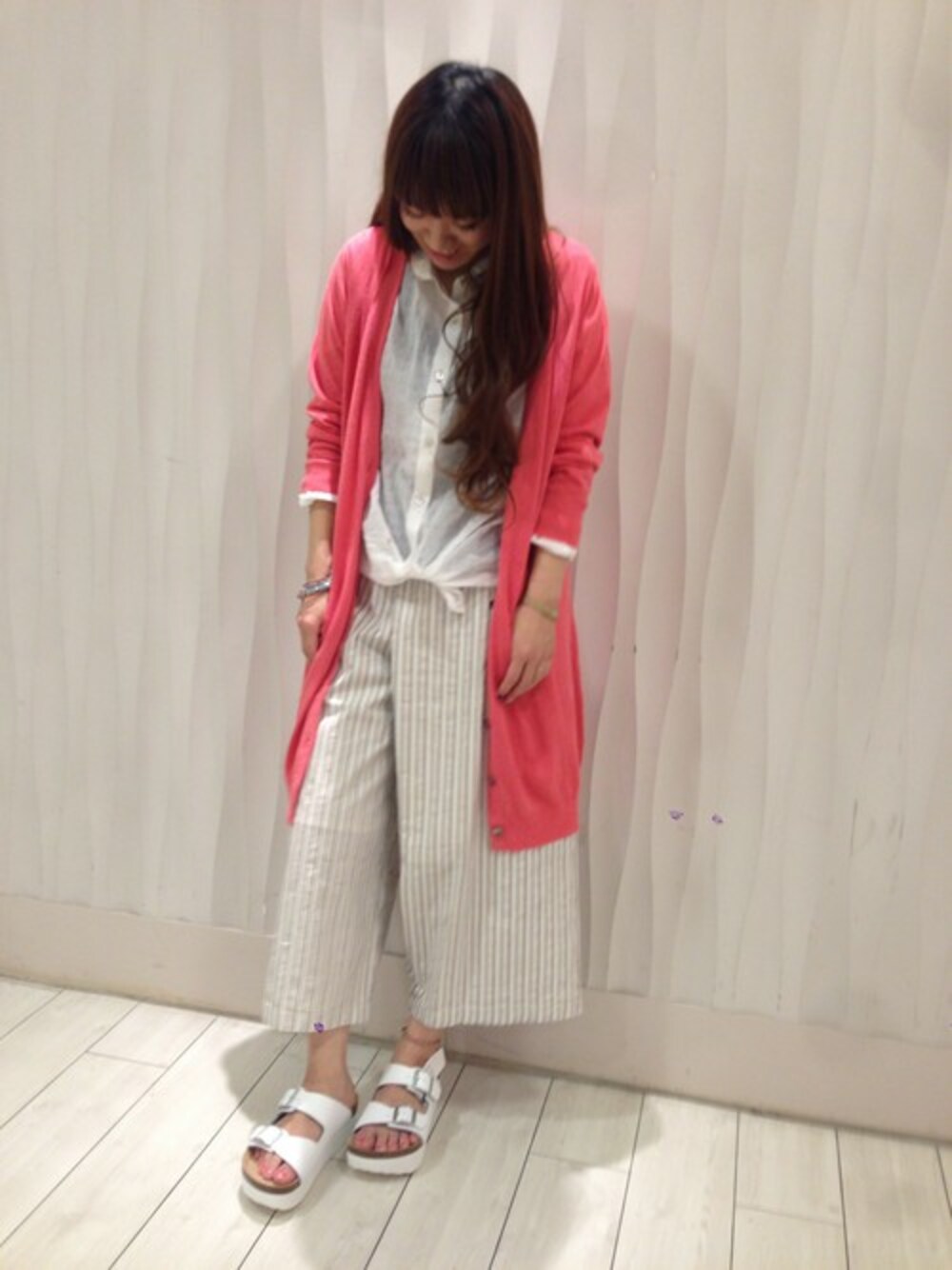 インパクト大のピンクロングカーディガンは甘くならないように、ゆるワイドパンツで大人ナチュラルにまとめました! 白シャツにパンプスならキチッと感もあってお仕事にもgood★ プライベートならロゴのTシャツに変えるだけでリラックス感が出るので、着まわしも抜群です!