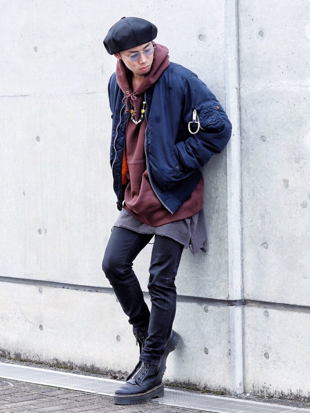 ストリートスタイル アリクスのMA1、夏のセールで1万円やったんやけどやっと着られた🤩 MA1を使った王道ストリートスタイルはYラインを意識して、無骨に男らしく合わせるとかっこいいんじゃないかなって思います😁