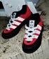 ブラックコーデにワンポイントとして赤のシューズを取り入れたコーデ❤️🔥