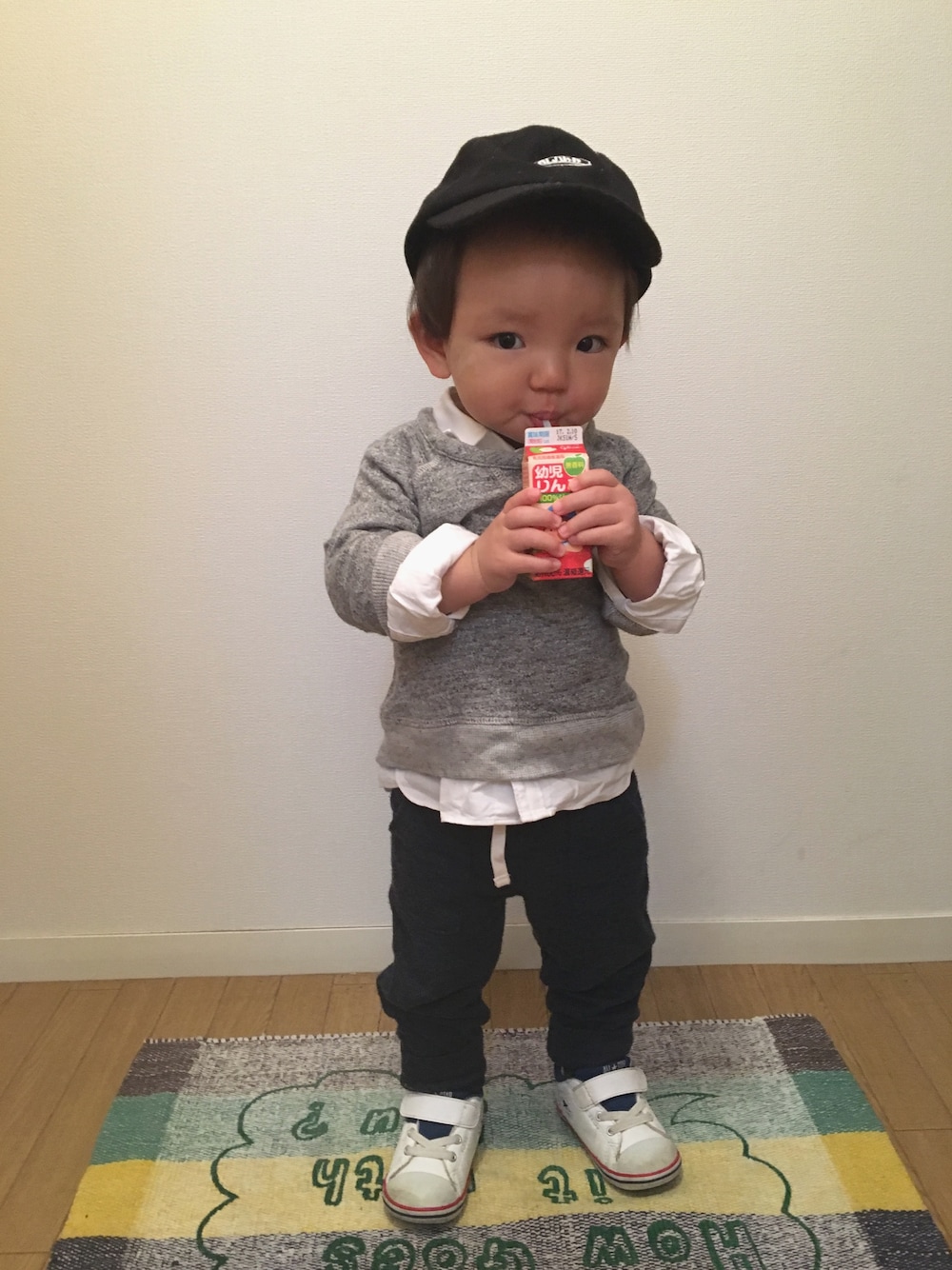 ジュース真剣に飲みすぎて目付き悪い😂😂 gapコーデになりました✨✨まっしろしろすけフェス写真撮れたら参加したいな😍