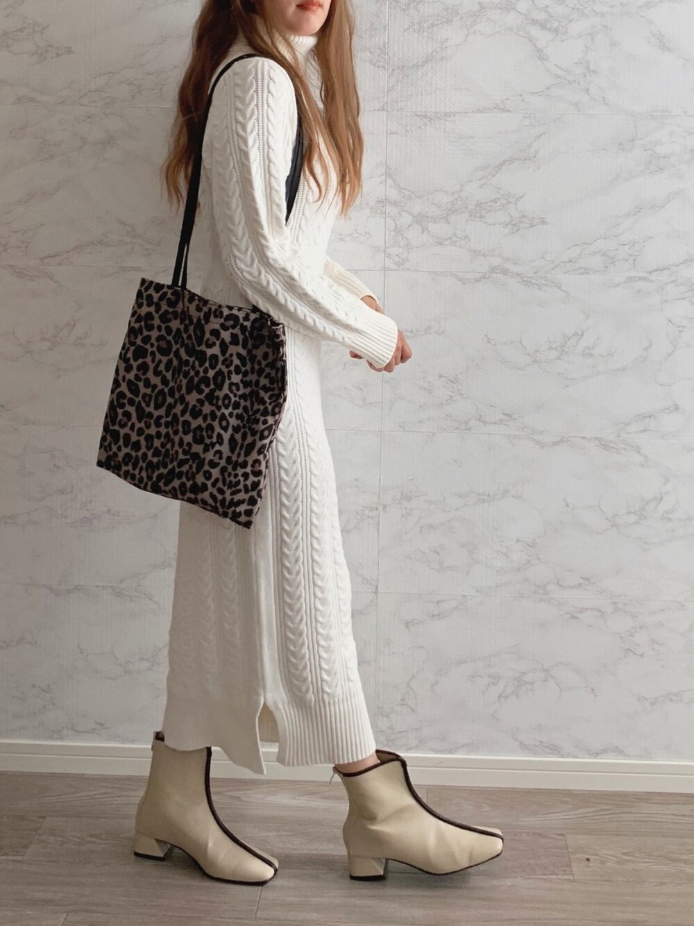 anmiのワンピース「オフタートルケーブルニットワンピース」を使ったコーディネート