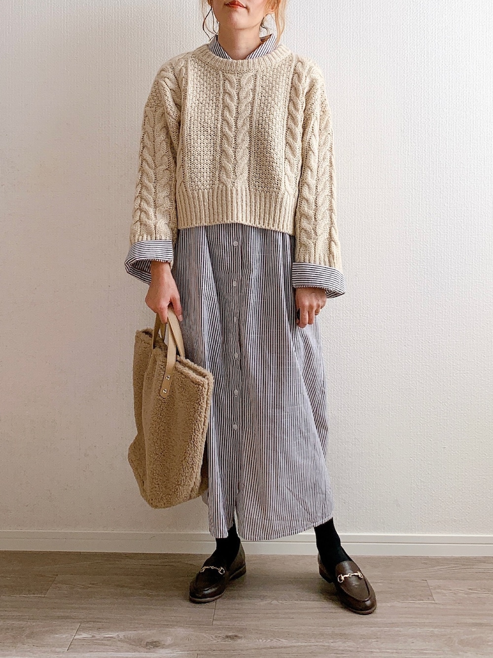 いいね、セーブ、フォロー ありがとうございます* Crispさんの クロップドケーブルニット着回し*.♡ このざっくり感🧶と編み模様可愛いすぎ💕 しっかり裏も模様入ってます☺️ 本日クーポンdayです♡ 今回はレイヤードしてみたよ🎶 DHOLICさんのストライプロングシャツワンピースはブラウンのライン♡♡ (写真ネイビーに見えるけど🙄) ベストとも合わせたいなーと思います🥰 見てくださってありがとうございます✨ 𝕝𝕟𝕤𝕥𝕒𝕘𝕣𝕒𝕞➜anmi_wear フォルダイン maキshiさん💪♥ litt1emyさん♡ izumiさん♡ 👿さん♥ chicoちゃん♡ ありがとうございます🙇♀️