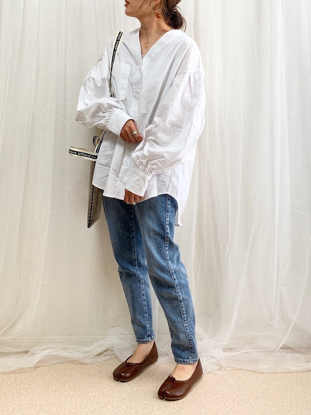 anmiのシャツ/ブラウス「パフスリーブVネックシャツ」を使ったコーディネート