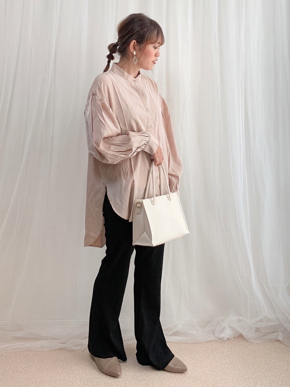 anmiのシャツ/ブラウス「シャイニーバンドカラーシャツ」を使ったコーディネート