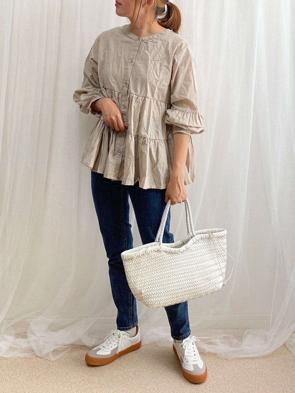 見てくださりありがとうございます𖧷 ベージュのティアードブラウス❣️ (撮り忘れましたが)backにスリット入り♡ 薄めで今時期の羽織にもピッタリ🦤◎ デニム合わせでカジュアルに👖 ジャーマントレーナーは チキちゃんがおすすめしてたやつ♡ຼ☺︎ 旦那さんとお揃いで買ってたから 私も旦那とお揃いで買いました( ー̀֊ー́ )✌︎ そのうち登場する…かも|- -)笑 Instagram➞anmi_wear
