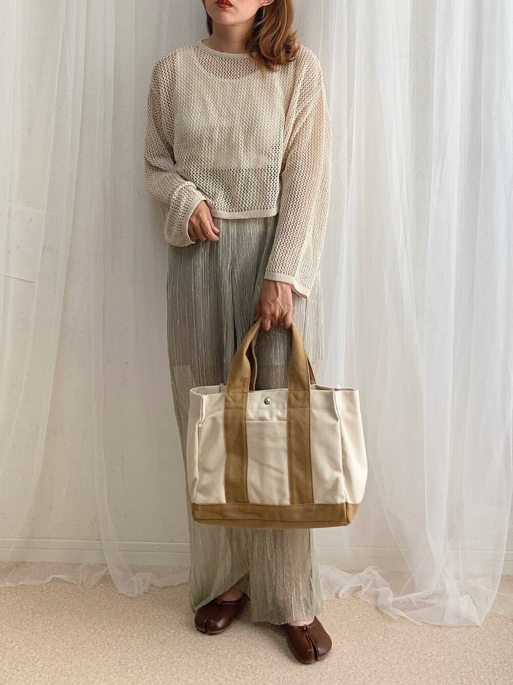 見てくださりありがとうございます◡̈⃝︎⋆︎* また淡色コーデ⸜❤︎⸝ chillfar/ シャイニープリーツパンツ 涼し気なシアーのパンツ✨ きらきらして可愛いです♡ しまむらのメッシュカーデと 相性良きでした💕 Instagram➞anmi_wear