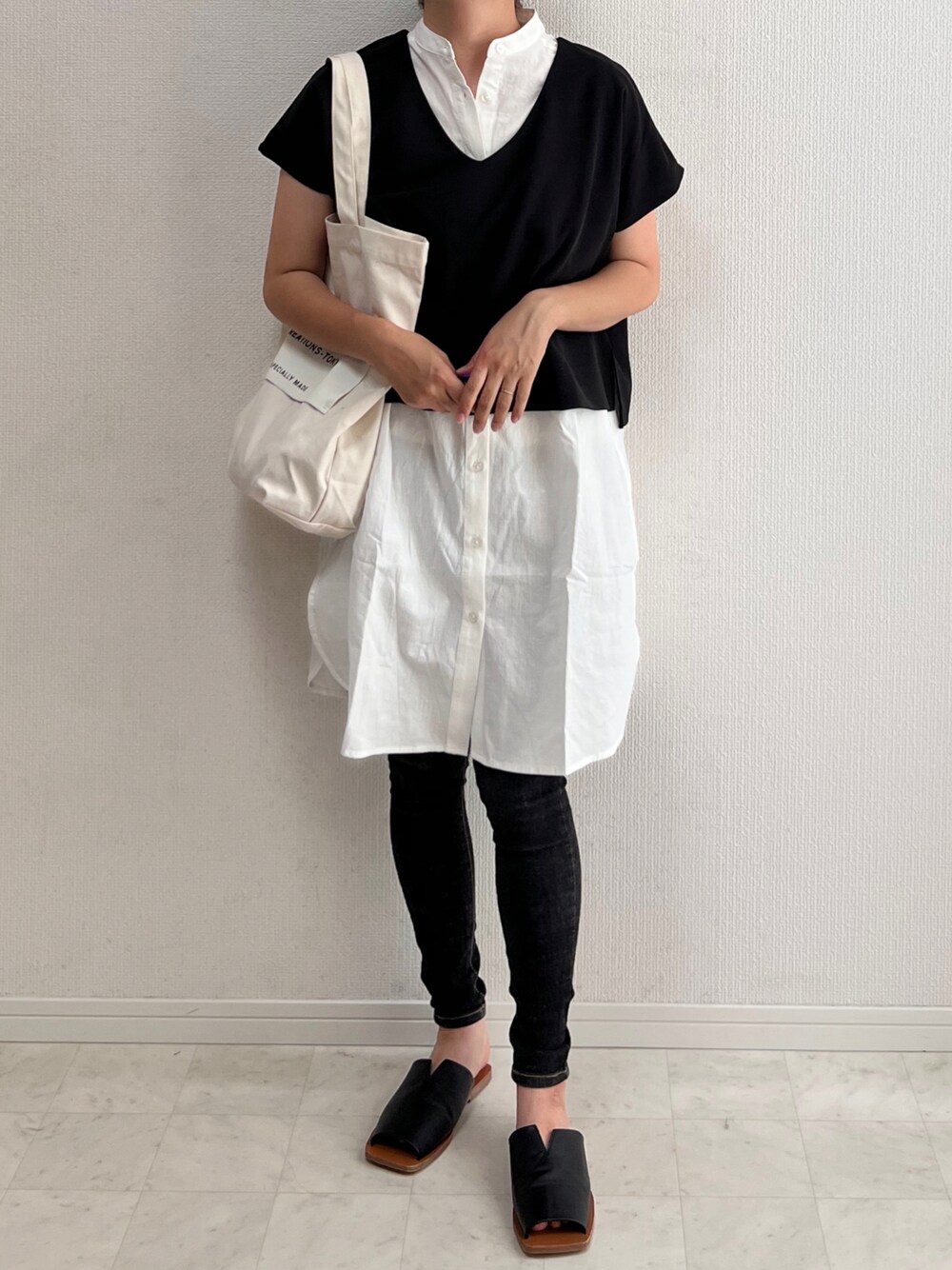 anmiのワンピース「製品洗いレイヤードシャツフレンチスリーブワンピース」を使ったコーディネート