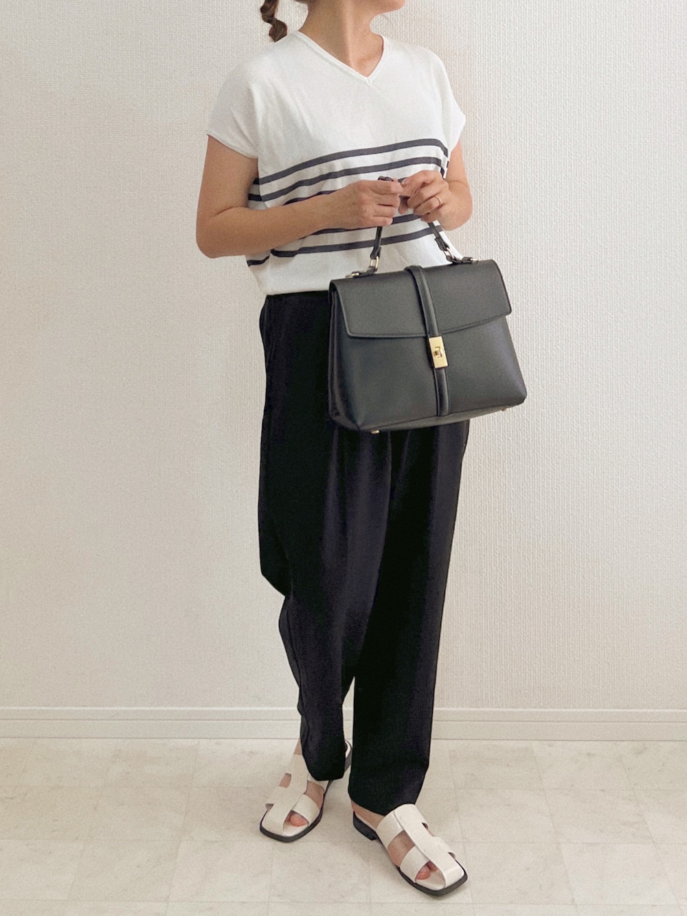 OMNESの レーヨンナイロン Vネックドルマンニット でプチプラコーデ 接触冷感でひんやり気持ちいい、 サラッとした着心地のニットです。 ネイビーのボーダーが大人っぽくて可愛い! バッグはWEARISTAの陽さんの しまむらコラボのものです⸝⋆ 見てくださってありがとうございます。 - - - - - - - - - 𝘐𝘯𝘴𝘵𝘢𝘨𝘳𝘢𝘮 ▸▸▸ 𝘢𝘯𝘮𝘪_𝘸𝘦𝘢𝘳