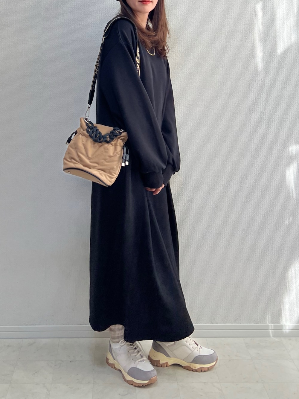 anmiのワンピース「ソフトダンボールニットボリューム袖ワンピース長袖」を使ったコーディネート