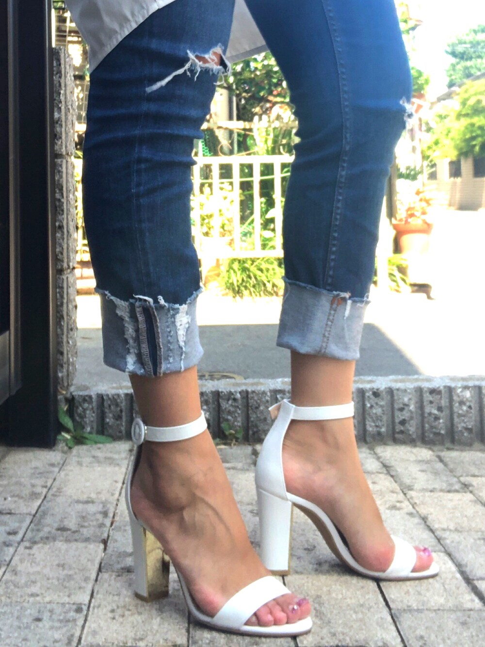 サンダルをメインに。 トップスも白のシャツワンピで夏っぽく。 ヒールは10センチくらい、太いヒールだから安定感はあるけど、たくさんは歩けないのが悲しいところ。 でも可愛いからいい!!オシャレは我慢!