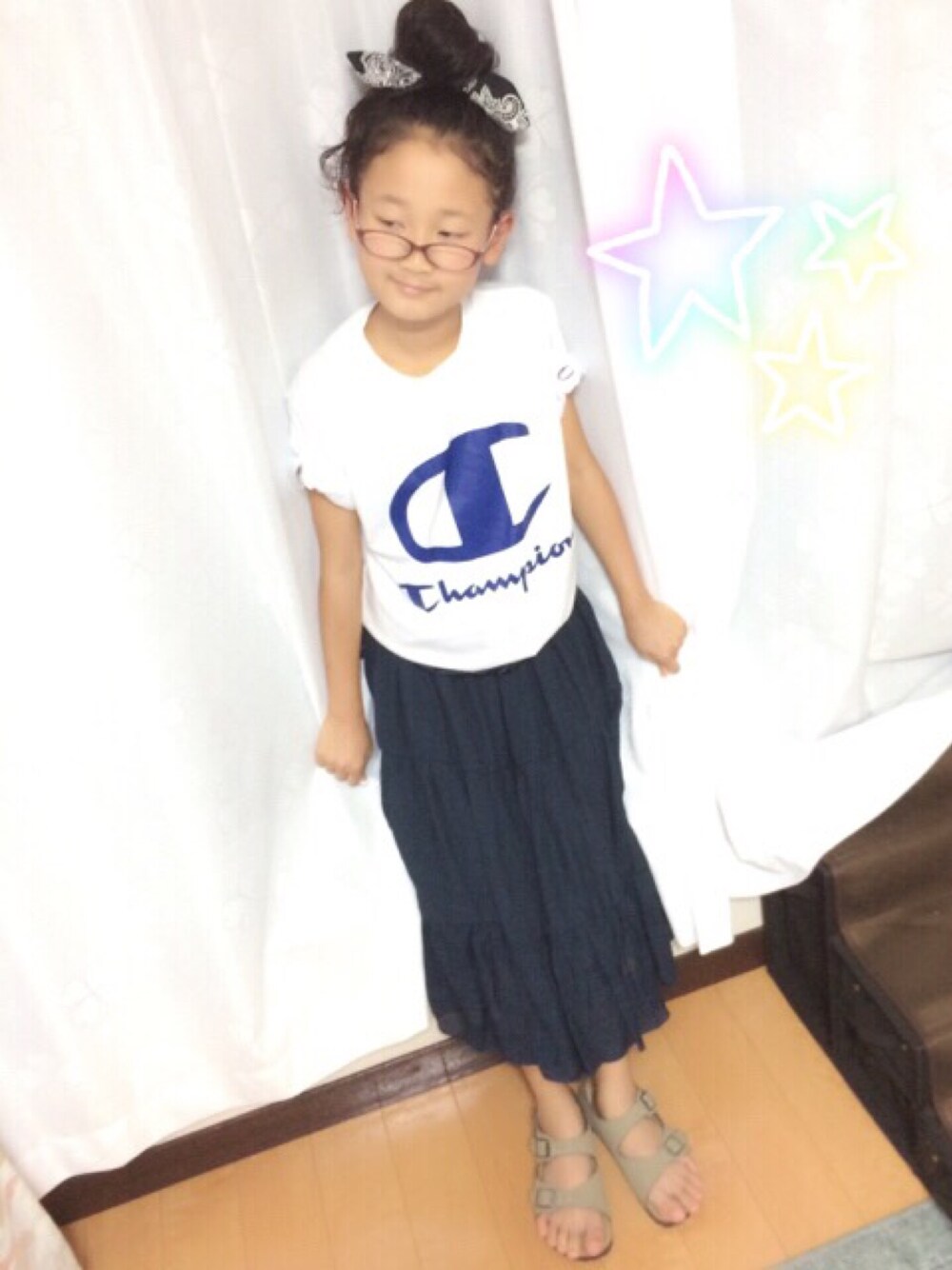 しまむらコーデ。 プチプラです😁チャンピオンのTシャツ900円くらい。ロングスカートも900円くらい。 娘はロングスカート、私の?って超嬉しそうでした。