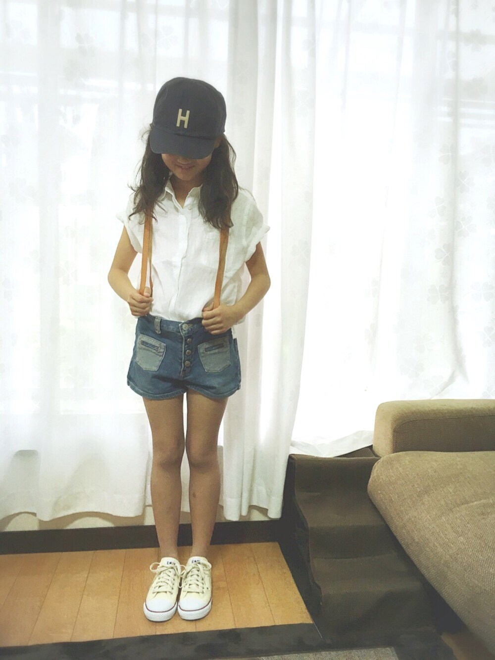 リネンのシンプルなシャツ。夏が楽しみ。 またショートパンツで申し訳ないです。楽チン。革のサスペンダー古着屋で500円でした。お気に入りです。