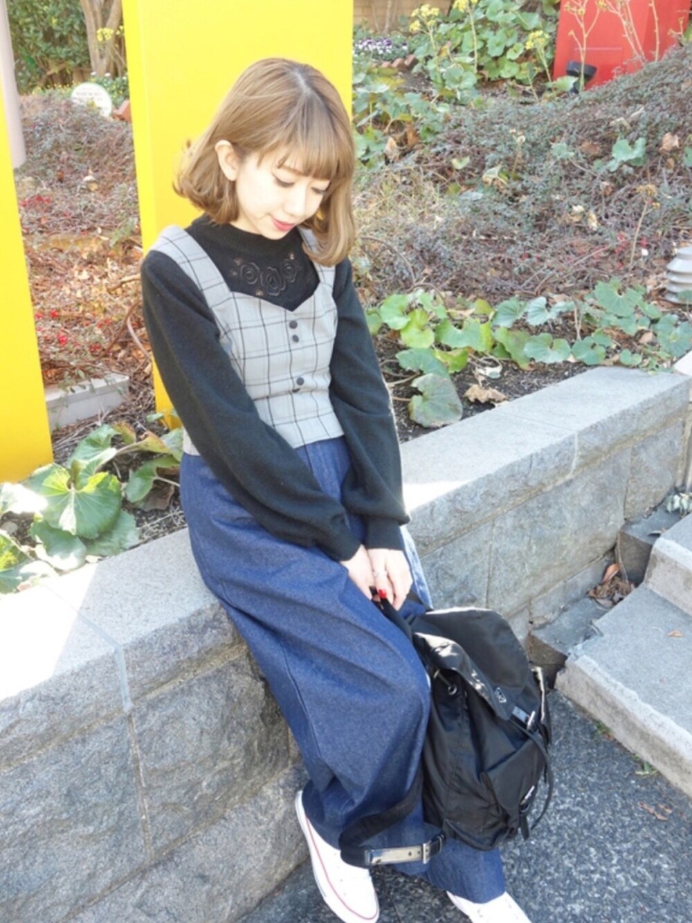 ニット&デニムパンツのシンプルコーデに アクセントをプラスするならビスチェがおすすめです♪ ショート丈とコンパクトなサイズ感が ワイドパンツとも好相性です♡