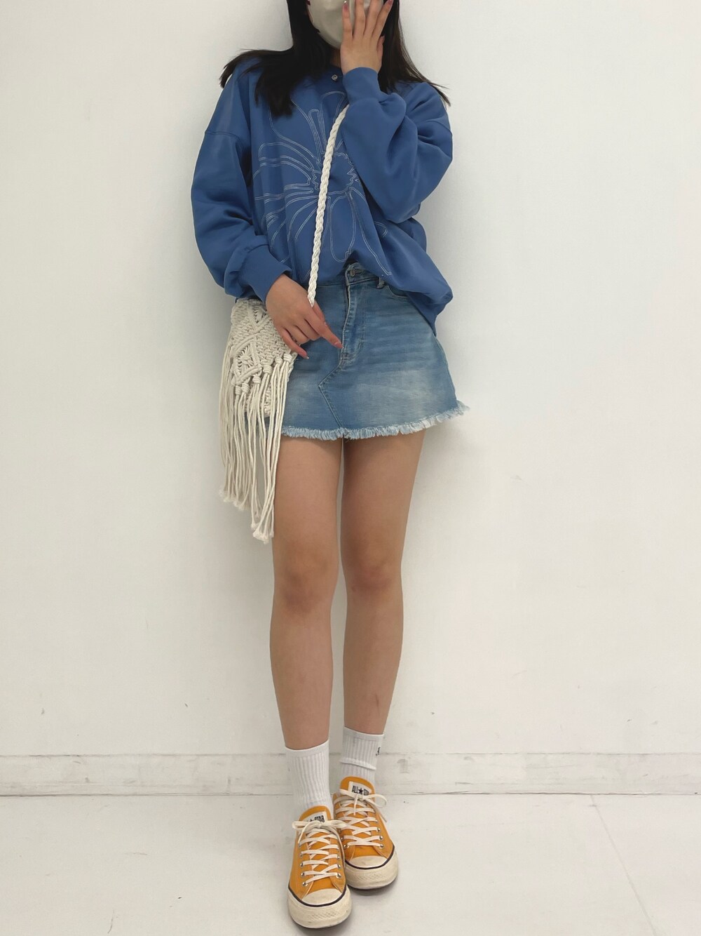 春らしいブルーのスウェットで、気分も軽やかに。 ゆったりめのトップスにデニムミニで、バランスよくカジュアルダウン。 マクラメバッグでちょっぴりナチュラルな雰囲気もプラスしました。 足元はお気に入りのイエロースニーカーで、コーデに元気カラーをひとさじ◎ シンプルだけど、色や素材感で遊ぶのが最近のマイブーム! お散歩や友達とランチに行く日にもぴったりな、気取らないスタイルです。 リラックスしながら、自分らしく春ファッション楽しみ中♪