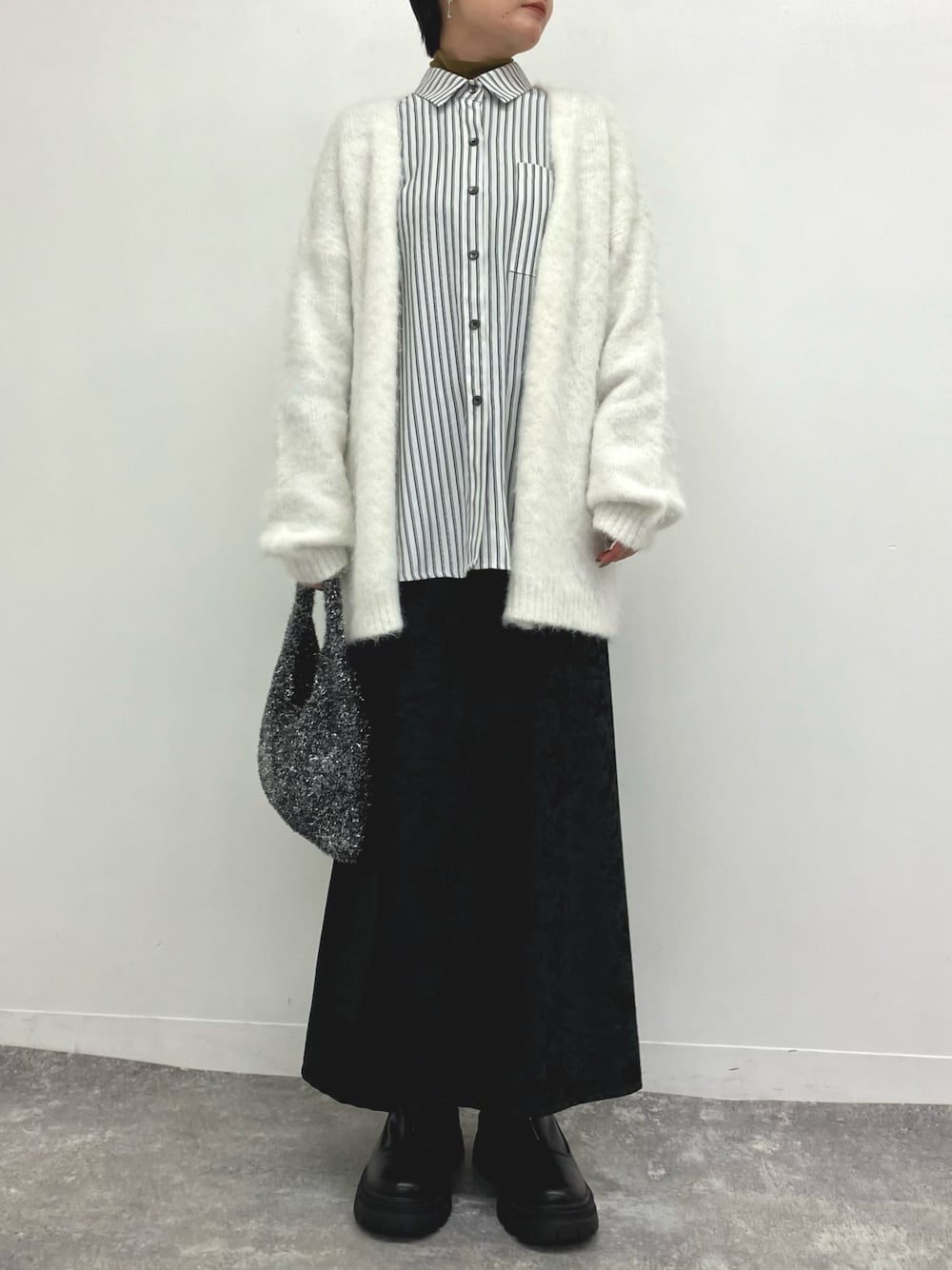 白のモフモフカーディガンで キレイめコーデ💁🏻♀️🤍 シルエットもゆったりと 全体のボリューム感もあって着心地も良いです🥹🫶🏻