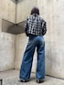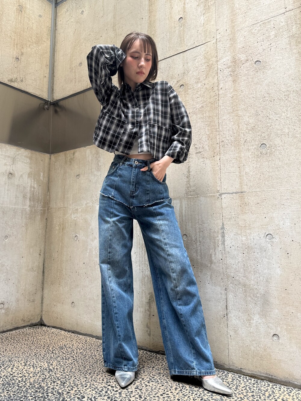 チェックシャツのボタンを開けて、あえてインナーを見せるコーディネート! シャツは腕をまくって着てます♬ デニムは今流行りのレイヤード風なデザイン! ゆるっとした履き心地でしゃがむのも走るのもバッチリ!◎ くつはシルバーを合わせてみました!