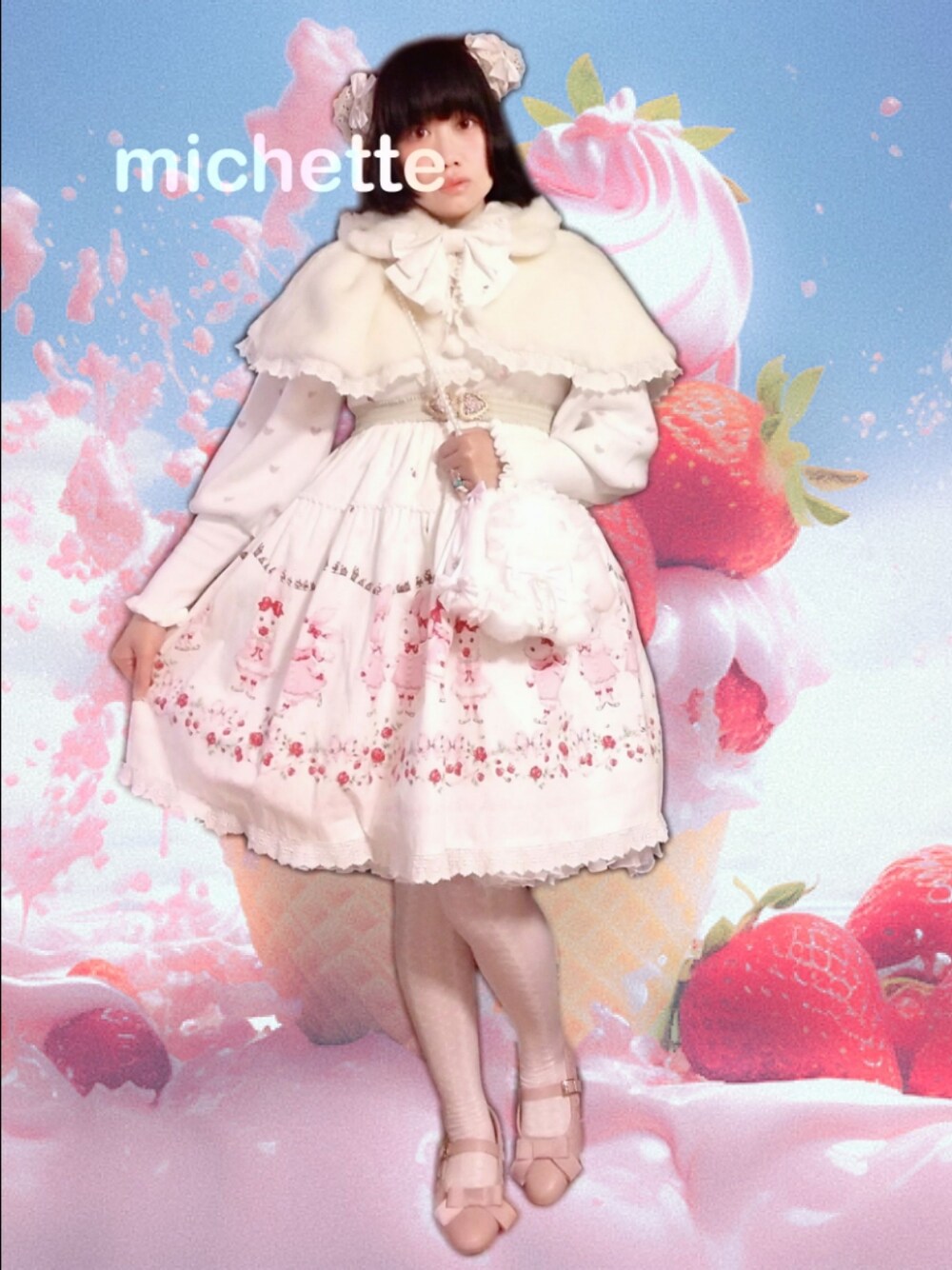 2024 SPRING 05(MAR) 冬の間に着てなかったファーケープとニットを着ました。引き続きイースターのイメージでウサギの柄(みるくちゃんとゆきいちご)のJSKで、色はアイボリー×ピンク系のギリギリ冬っぽいコーデです。盛れなくてもいいやって気分の日でしたが本当に盛れてないなと思いました(笑)。レースカフスをシュシュとして髪に付けましたがこの髪型似合わねぇ~。このカフスかわいくてお気に入りです。カラートリートメントした後で髪にアイロンとか使いたくなかったので、レースカフス付ける土台を結んだだけで他のアレンジなしです。JSKにゴムベルトが合うのかいまいち分からないまま合わせました。JSK付属の共布リボンブローチをケープのフック部分に付けたのがポイントです。ウサギのバッグはふかふかで中身が入らなすぎてポーチ以下でコスメを直に押し込むしかない位の微容量です。でもかわいいから良しです。 チョーカー:LIZ LISA/リング2:YELL/ウエストニッパー:aimerfeel/長袖インナー:nissen/パニエ:MAM MAXICIMAM/ドロワーズ:BODYLINE/ストッキング:cecile メイク…CEZANNE/クッションファンデーション(10 明るいオークル系) アイブロウパウダー:Visee(ピンクブラウン) アイシャドウ:CANMAKE(キューピッドペタル) アイシャドウ(涙袋):MAJOLICA MAJORCA(花言葉) アイシャドウ(黒目の下のみ):MAJOLICA MAJORCA(すずめ) アイライナー:CANMAKE(ローズグレージュ) アイライナー(涙袋下中央):CANMAKE(ピュアレッド) マスカラ:heroin make(ブラウン) チーク:PAUL&JOE(キャンディ) リップ:WHOMEE(W.W 血色ピンク) リップグロス:excel(ハニーピーチ) カラコン:miium(カーヴィピンク)