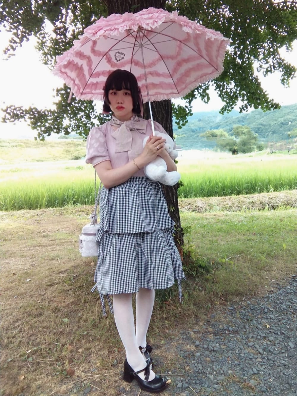 3段フリルのロングスカートの3段目のフリルを内側に折り込んで大きい安全ピン複数個で留めて膝丈スカートにアレンジしました。でもシルエットが綺麗という訳でもないので一回きりかな(別の長め丈スカートでも試したけどデザインによっては見た目が自然にならなくてうまくいかないんだよね~生地に穴を空けただけで終了したという…笑)。 一回しか着てなかったトップスを着ました。結ぶタイプのタイが左右対称の長さに出来ないけど、刺繍が入っててかわいいです。 このストラップシューズは合皮がひび割れててパリパリしてきてもう寿命なので買い換えたい…。 外がムワッとしてて滅茶暑くて、顔狙って飛んでくる小さい虫がいっぱいいて最悪でした(笑)。目に虫入ったし。 前髪ウィッグ:AQUADOLL/ネックレス:INGNI/ブレスレット:Q-pot./リング(2種):YELL/ウエストニッパー:aimerfeel/キャミソール:tutuanna/ドロワーズ:しまむら m♡petit