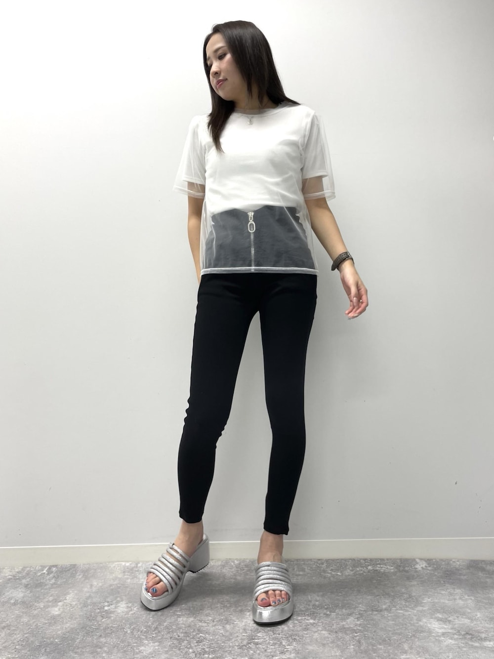 簡単にレイヤードコーデが完成する、チュールトップスとリブTシャツ🫶✨ スキニーパンツと合わせて大人きれいめコーデ😘