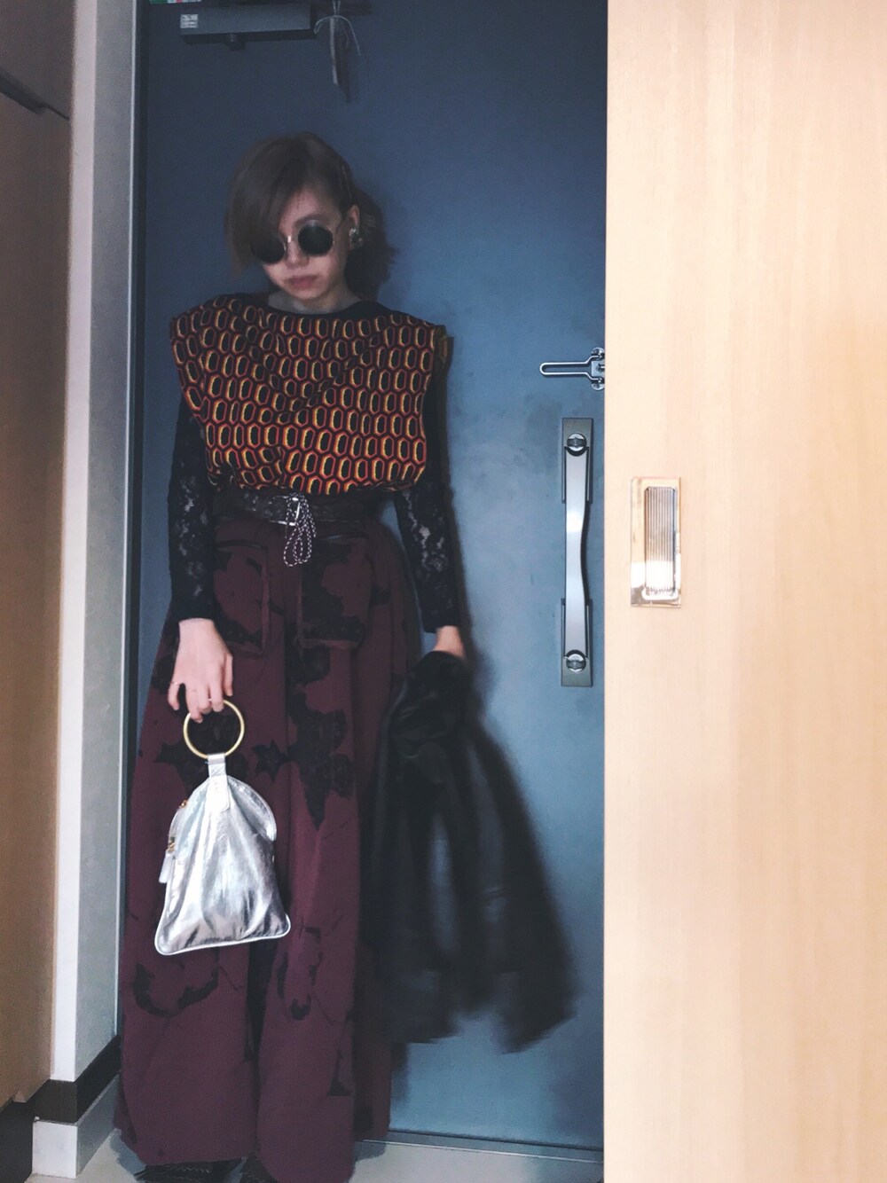総柄合わせ。 秋晴れの暖かさでレーストップス着用。