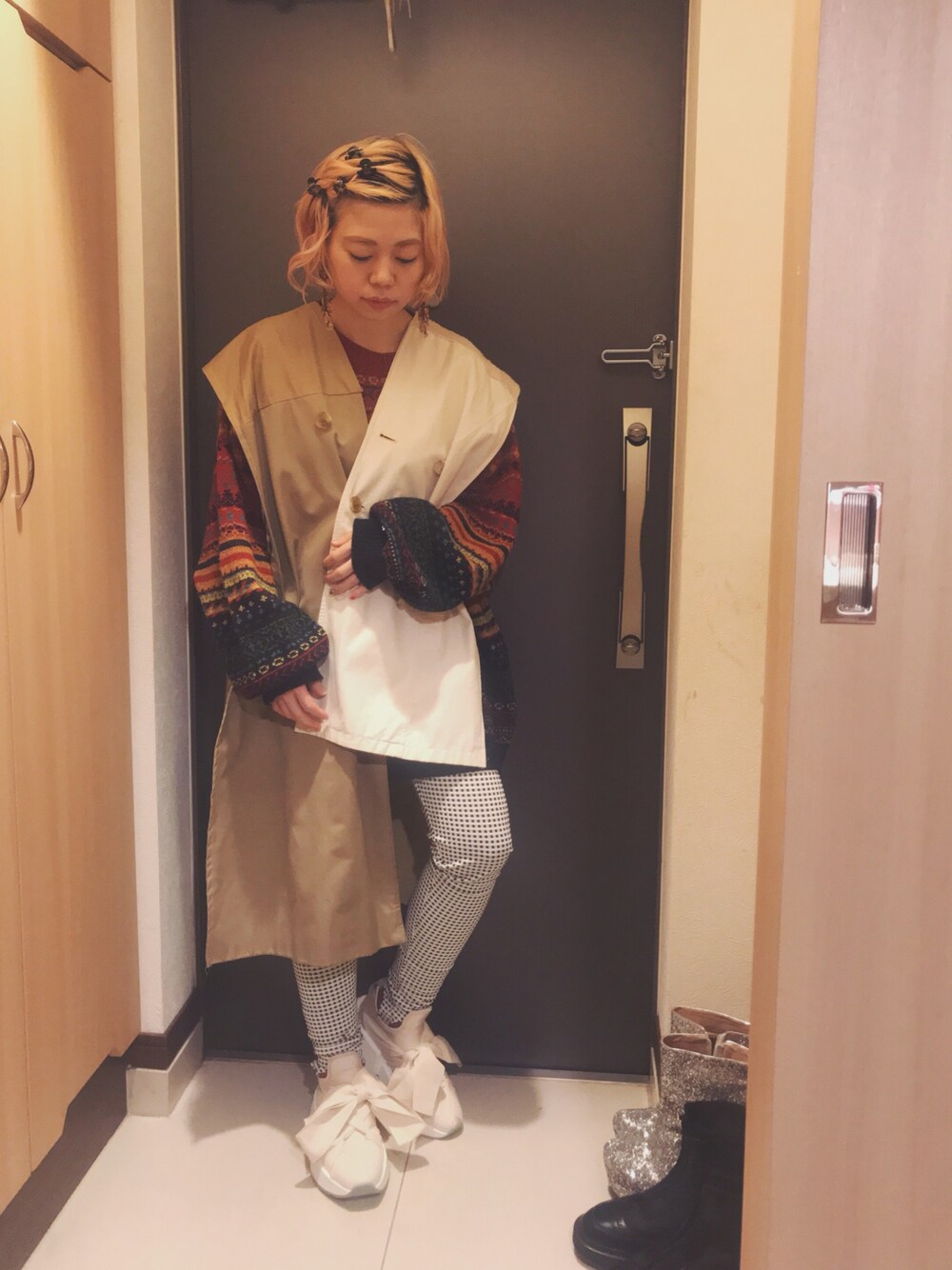 ニットオントレンチロングベスト。 春に気持ちを向けて明るいトーンを取り入れつつまだまだ着たいニット。 おニューの靴は12月のバースデーにいただいたMM6。可愛いディテールと歩きやすさ、真っ白ではなくオフなので汚れも目立ちにくそう。けれど大切に履きます。 OTOEで買ったレギパンはチェック柄がかわいい。柄と柄で合わせたくなる。