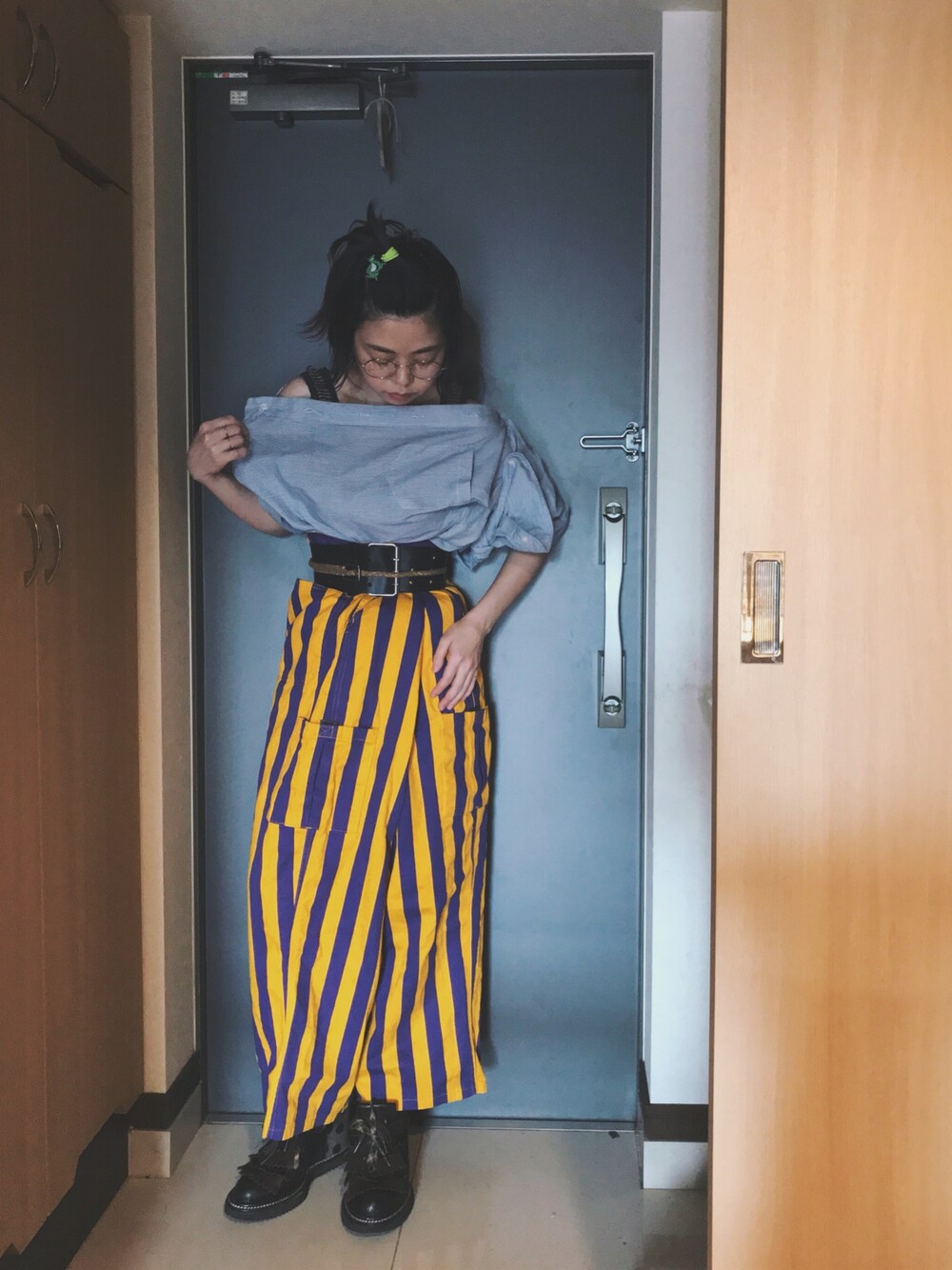 ウエストが二倍はあると思われるメンズパンツをウエスト部分を折りたたんでベルトで止めて着用。こういうデザインのパンツのようになりました。 上下旦那さんの服。