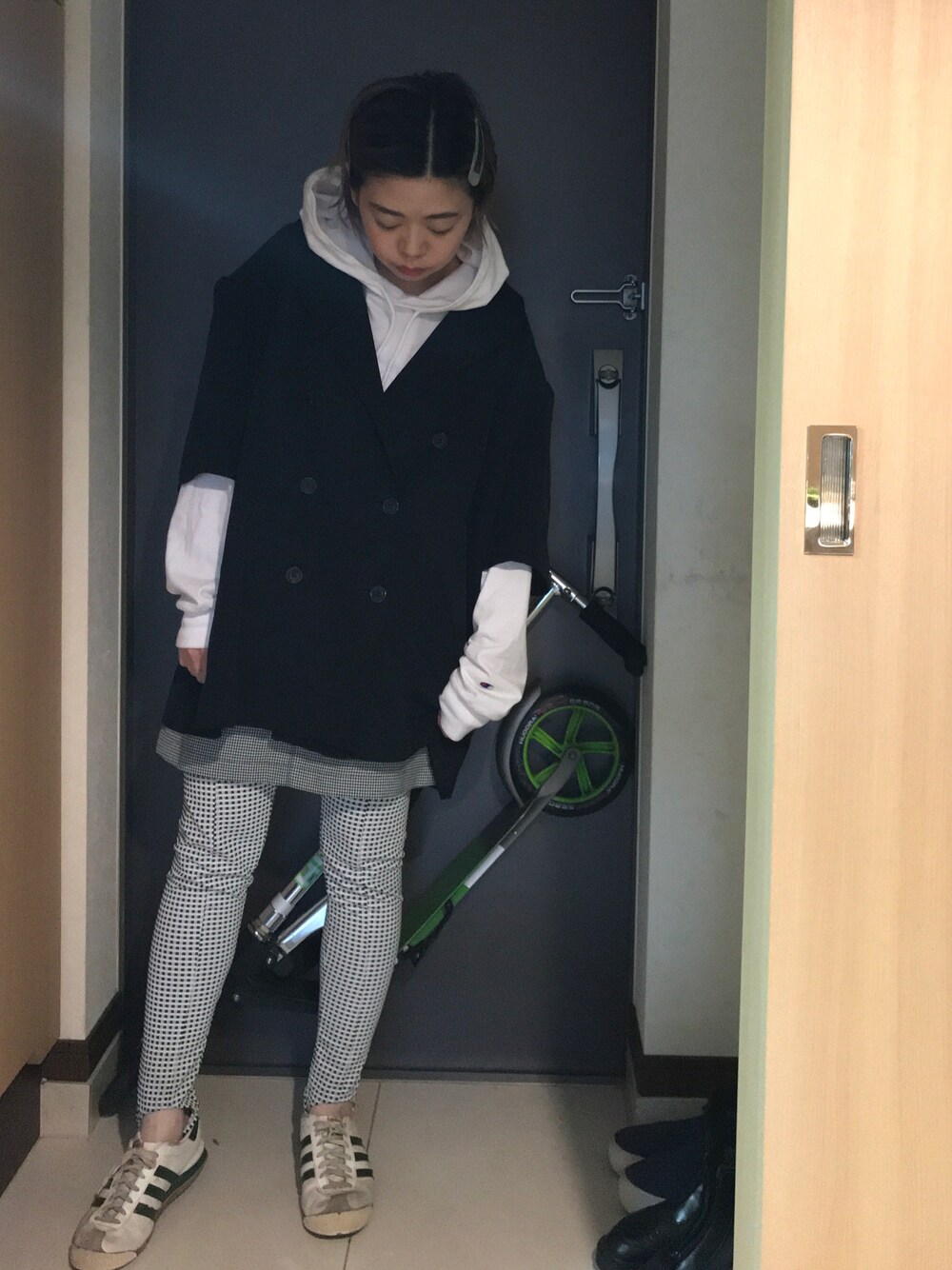 珍しいモノトーン。 メンズのオーバージャケットは半袖なのが珍しい。肌寒いからパーカーと重ね着。スカートはkotohayokozawaのパンツをセパレートさせたもの。