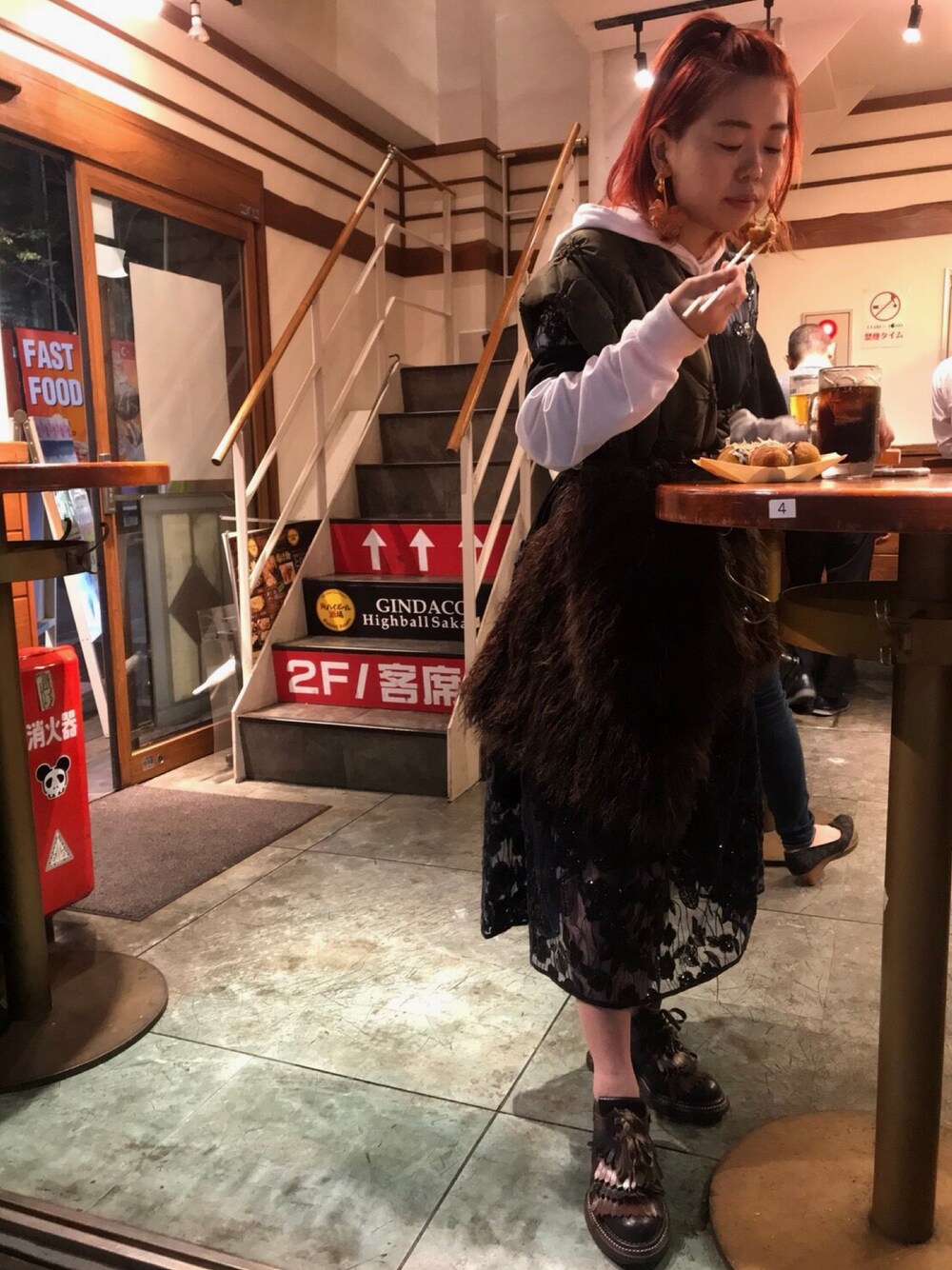 スパンコールキラキラなビンテージのシースルードレスの中にパーカーを着てマラミュートのマフラーを首じゃなくて体に巻いてベルトでとめた。