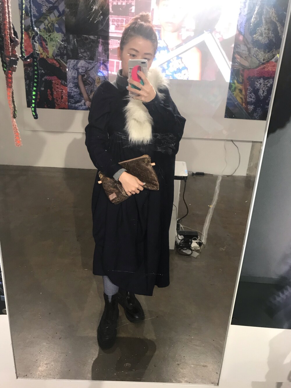 KANATAの変形ドルマンワンピとPOTTOのたすき掛けフェイクファーにお客様がくれたクラッチ。