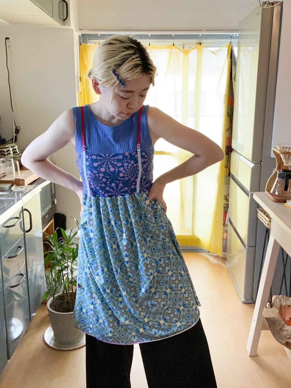 前髪が半端に長いのでこのタイプのヘアクリップを毎日つけています。 今日は新しくコレクションに加わったブルーのヘアクリップ。 ノースリーブニットに赤いストラップがポイントのホアナデアルコのカットソーキャミワンピ。 テロっとしたパンツに重ね着。