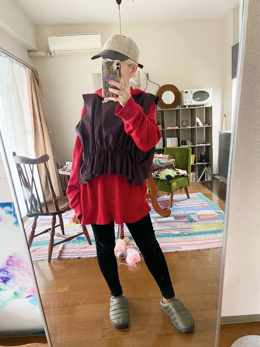 オーバーサイズのパーカーにギャザーデザインのトップスを重ね着。 ボトムはベロア素材のレギパン。 つばが革なのが大人っぽく締まるキャップは北参道にあるthemottehousetokyoで。