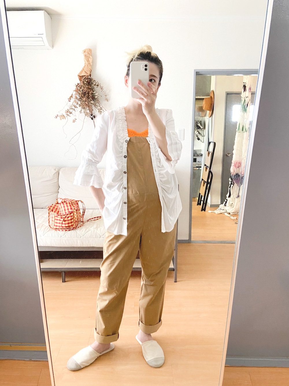ノースフェイスのマタニティオーバーオールは お腹の大きさに合わせて両サイドのジップの開閉具合で調節できる優れもの。 しかもお尻のところにもファスナーが付いていてファスナーを開けるとお尻のところがペロンと開いて、上から脱がなくてもお手洗いができます! 産後も活躍しそう。 インナーにはニットのノースリーブ。 フロントのギャザーと袖が特徴的なブラウスは前開きにして羽織として着ました。