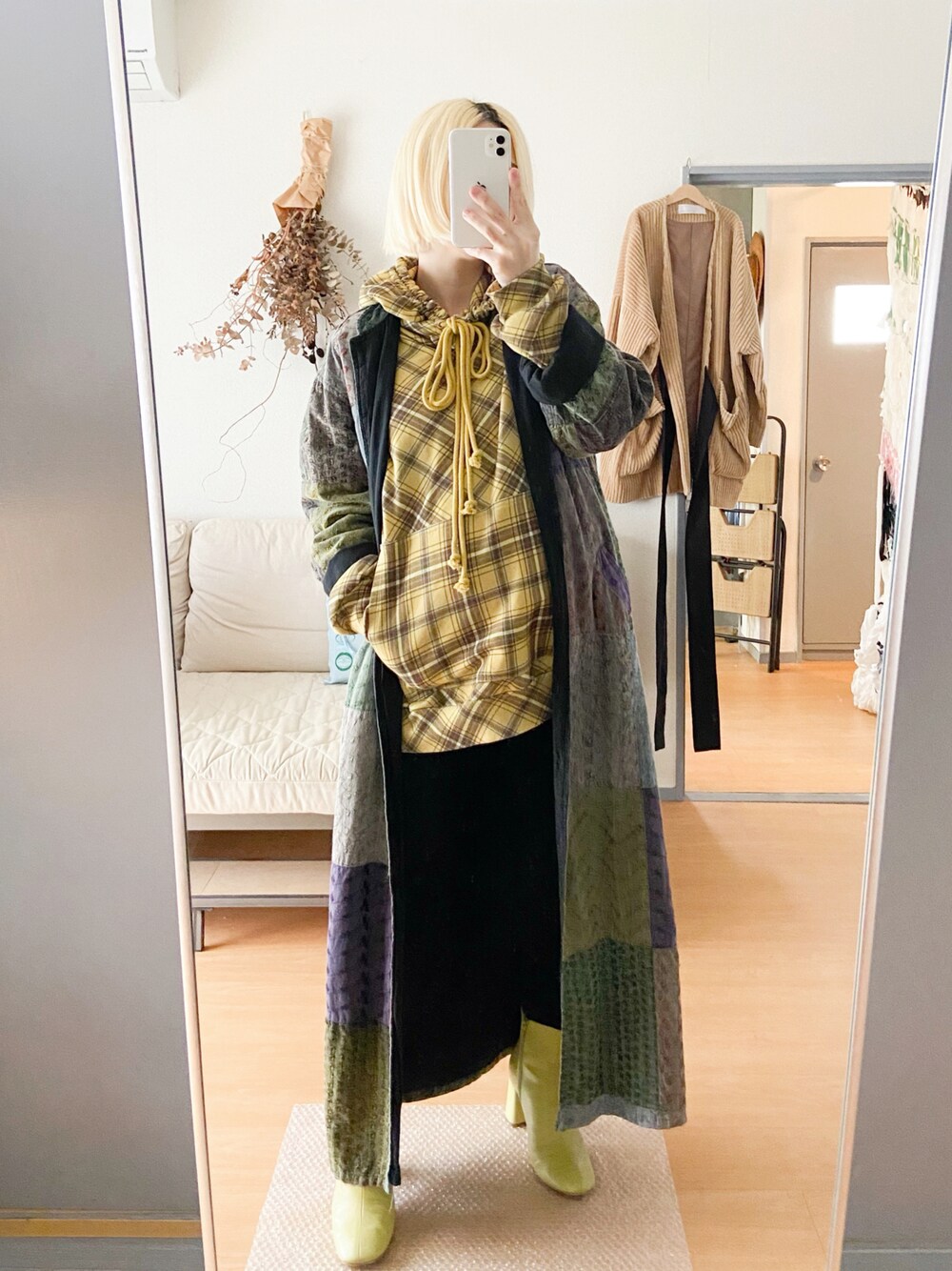 厚手の古着のワンピースをコート風に羽織にしました。 裏が黒いので黒いスキニーを履いたら写真では足が見えなくなりました。 去年から気に入って履いているイエローのカラーブーツを今年も。 マタニティ用のスキニー以外は去年も着ていた服たち。組み合わせを変えて今年もたくさん着ています。