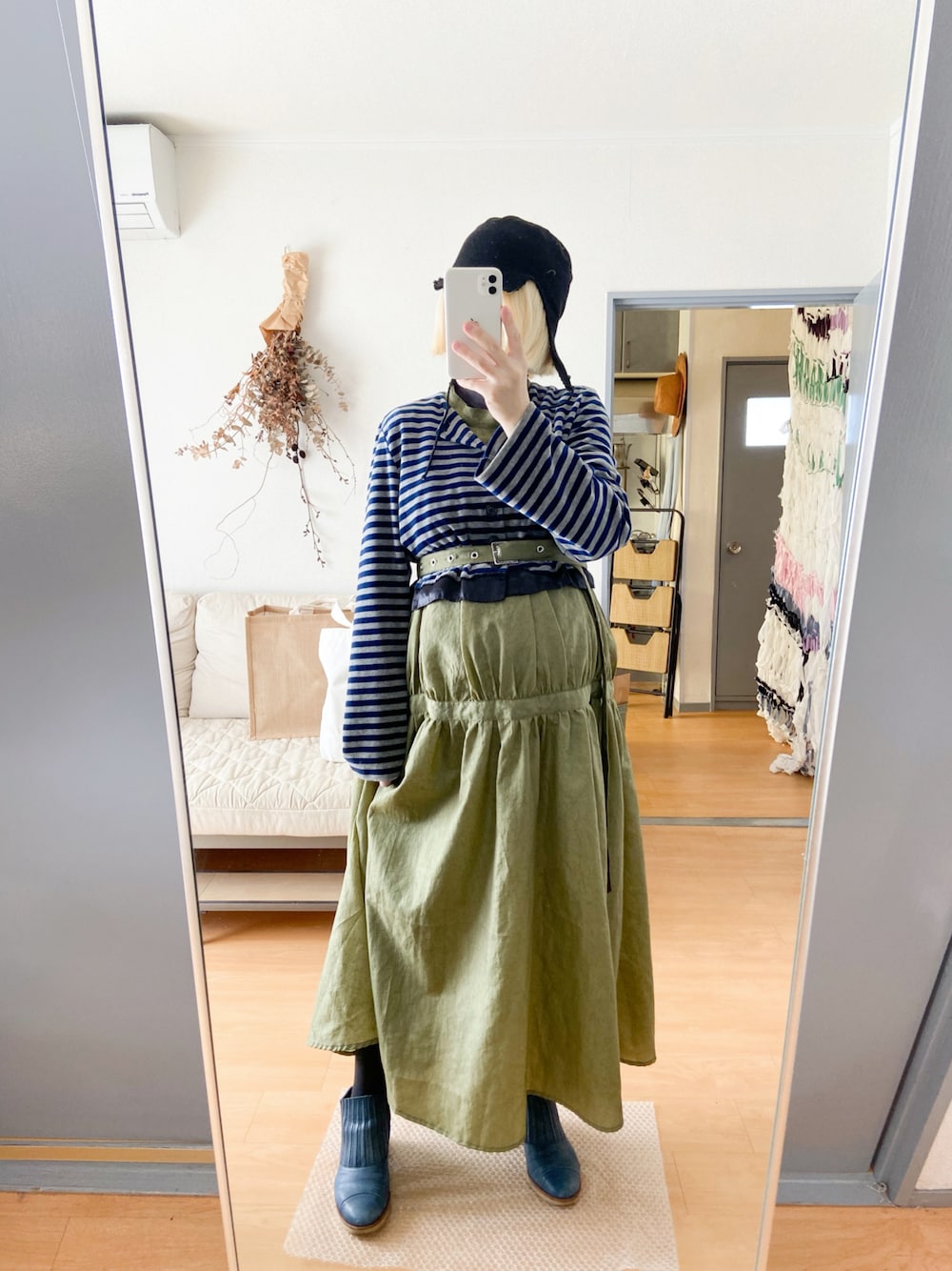 ワンピース付属のベルトをカーディガンの上からレイヤードしてポイントを上目にしてバランスを取る。