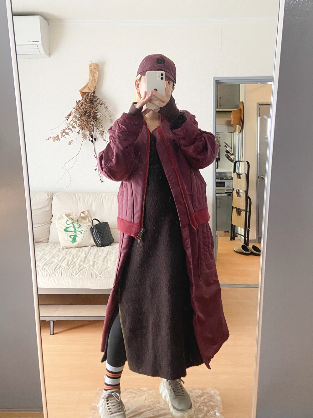 寒くなりすぎる前にデザイン性重視のアウターを着ておく。ブルゾンとロングコートレイヤードしたようなコートはメンズのもの。 タイツと靴下の重ね。
