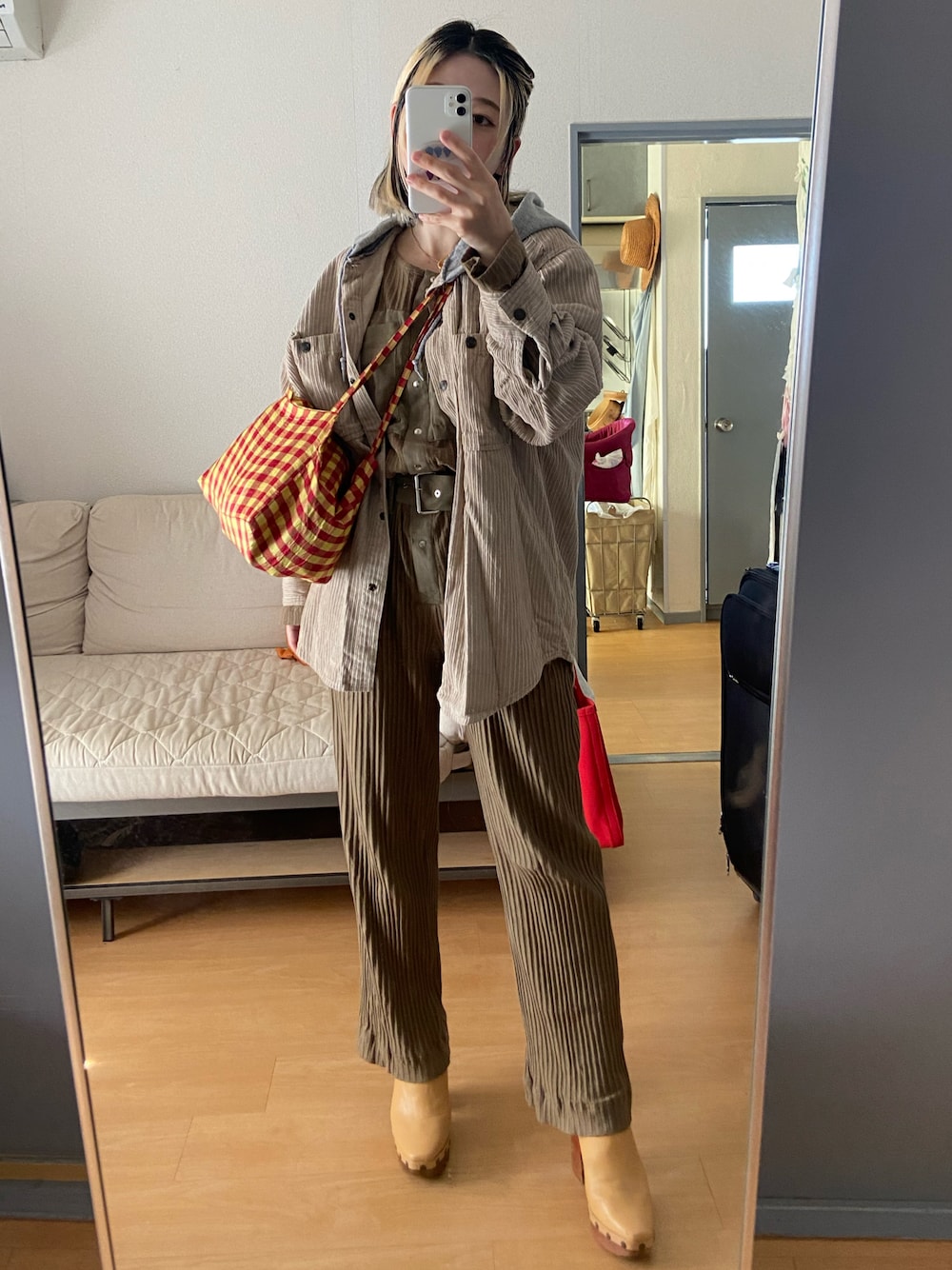 カジュアルにヒールを合わせたスタイル。 鞄で色を入れました。