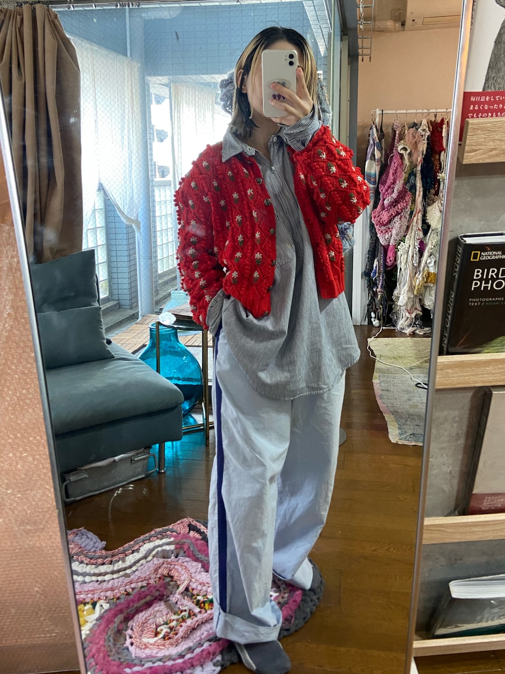 上下オーバーサイズにカーディガンだけコンパクトサイズでレイヤード。