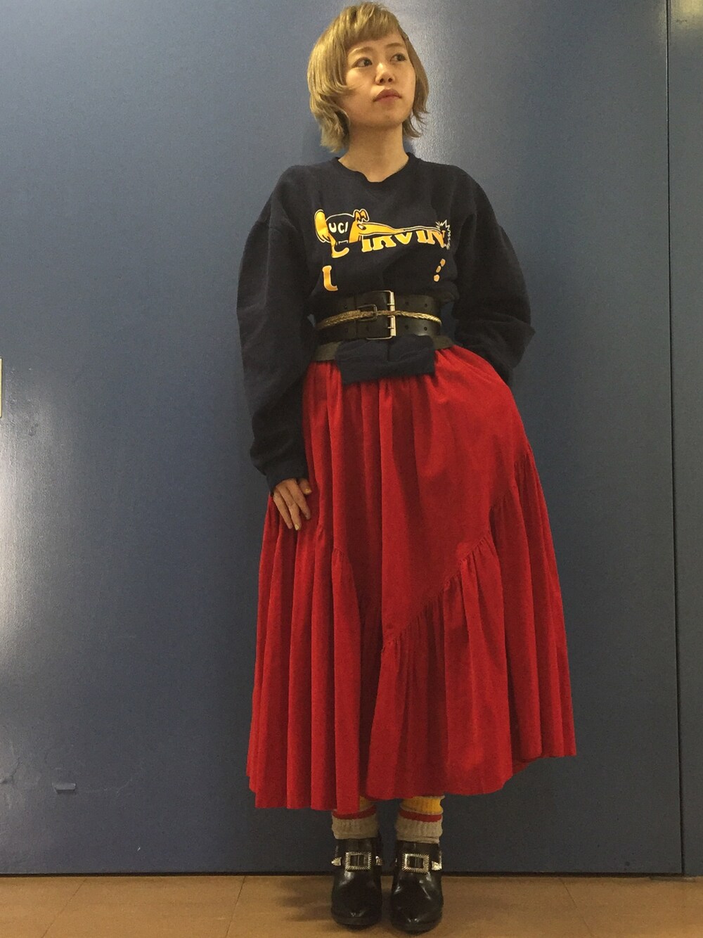 POTTOのリメイクスウェットとギャザーの入りが気に入っている真っ赤なスカート。スポーツソックスはラインの配色で選んで買います。