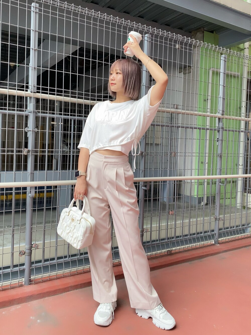 anchanのTシャツ/カットソー「ロゴ刺繍サイドリボンショートT」を使ったコーディネート