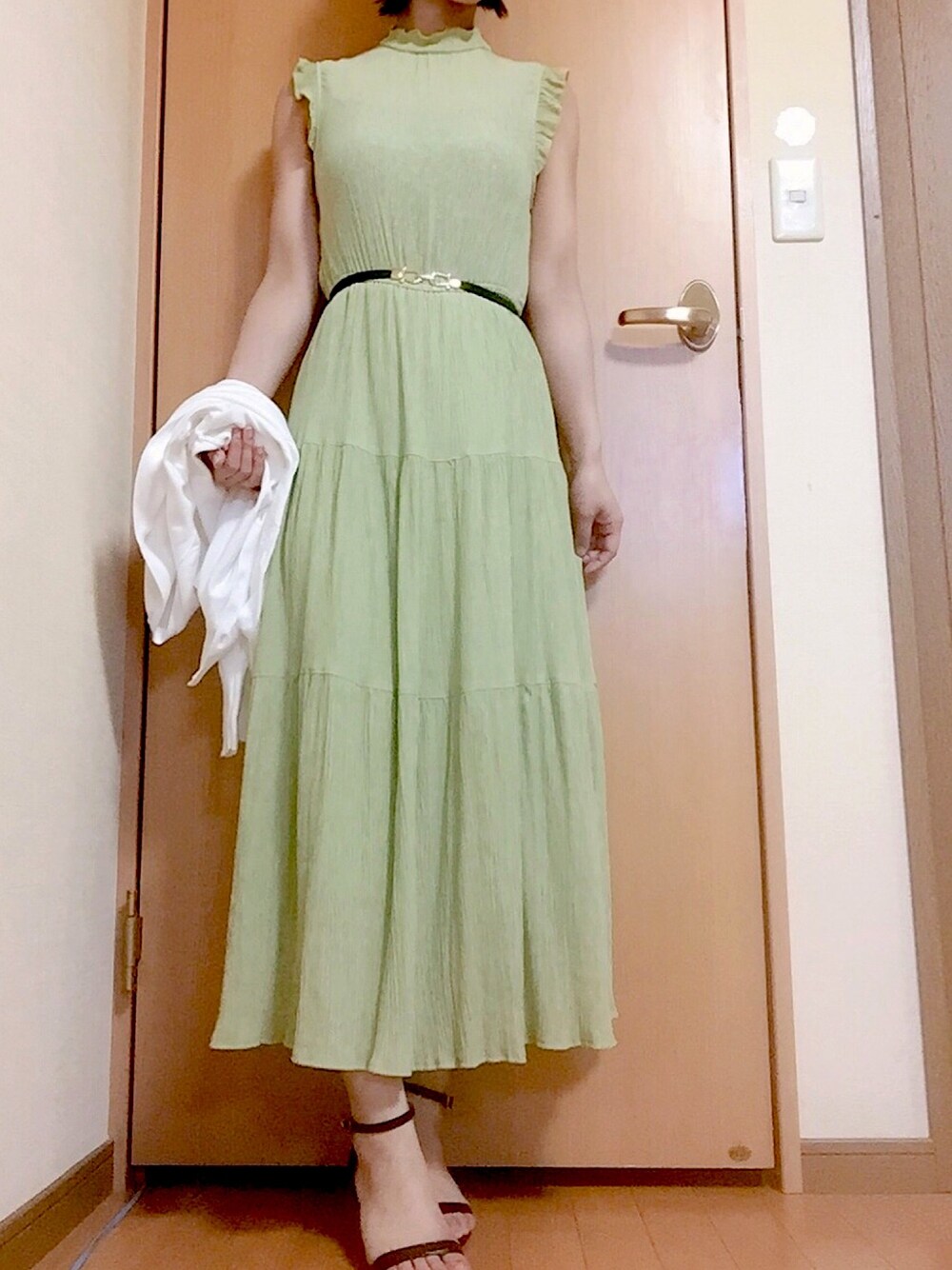 ピスタチオカラーが可愛いワンピース〇 素材がスラブっぽくてちょっとボテっとする感じだったので黒のベルトでメリハリをつけてみました☻ サンダルはベルトと同じカラーにして、 統一感を◎