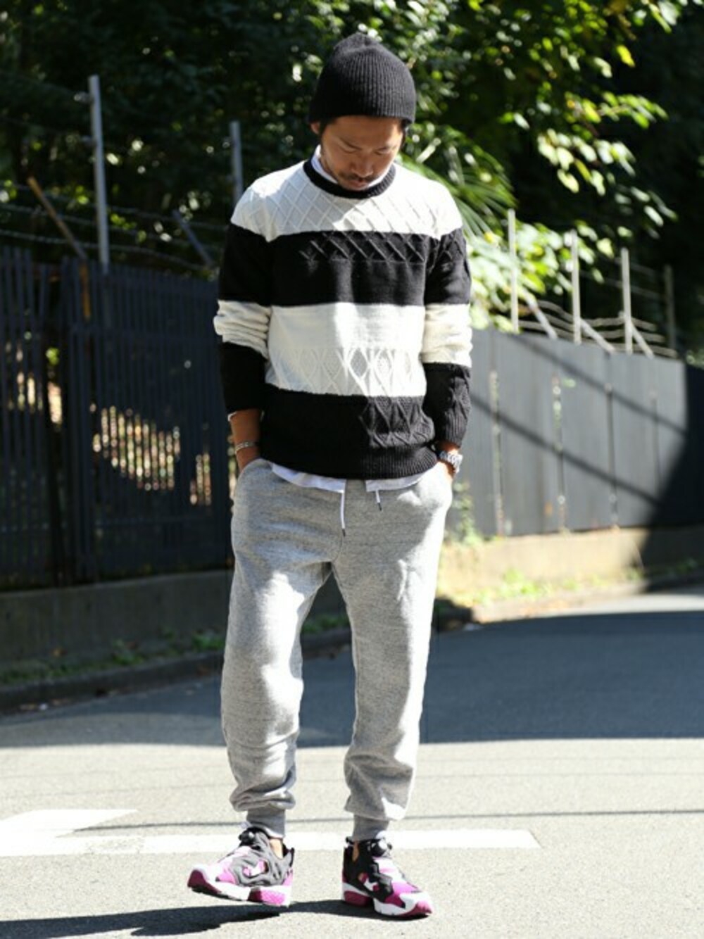モノトーンコーデの中にReebokのPUMP FURYを差し色に使ったスタイリング。