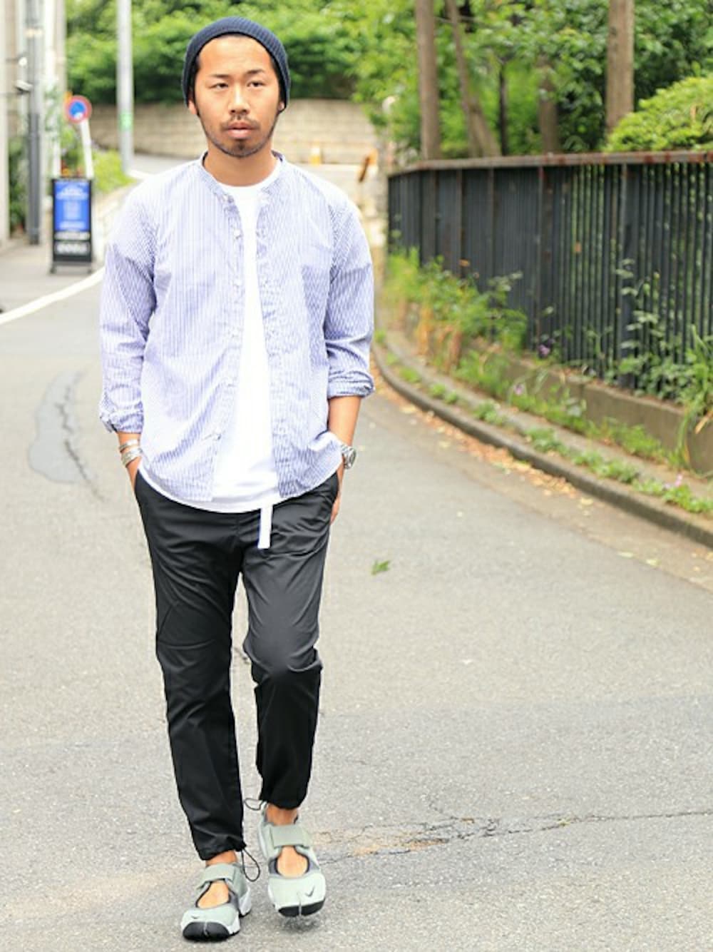 ストレッチの効いたスラックスにストライプ柄のバンドカラーシャツを合わせたアーバンスタイル。 足元のNIKE AIR RIFTがポイントになったコーディネートです。