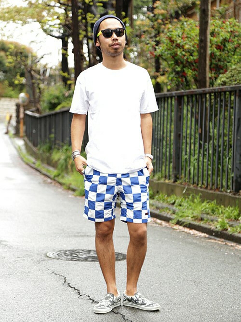 通常販売が始まったGRAMICCIのイージーショーツのチェッカータイプを使用した夏のスタイリング。