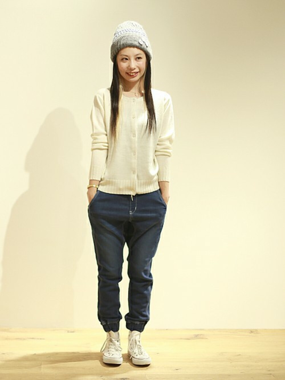 And A完全別注のLEE EASY PANTSを使ったスポーティースタイル。 ニットキャップとカーディガンを合わせたラフなコーディネートです!